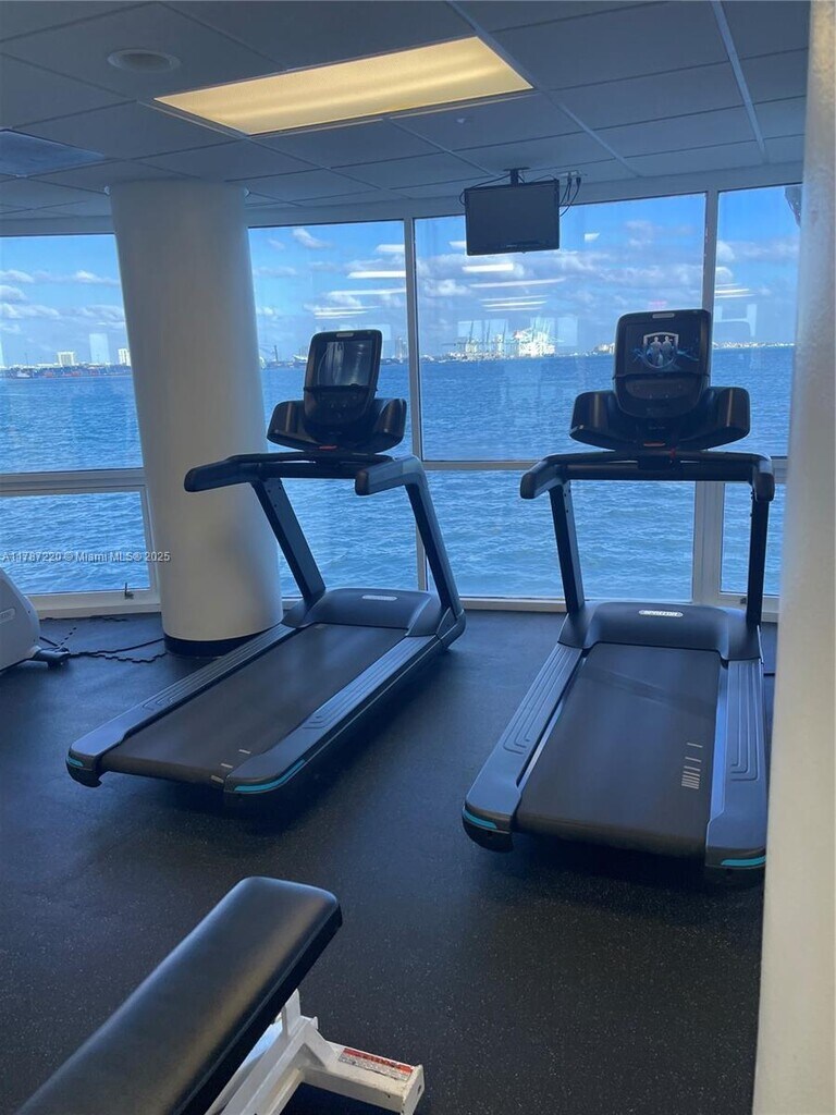 The interior living area is 791 sq. feet plus a 250 sq. ft. balcony with breathtaking views of Biscayne Bay, the Rickenbacker bridge, and the famous hole in the Atlantic building next door. The apartment has northern exposure, giving you gorgeous sunrises in the morning, but never direct sun. Just happy light with no baking heat. The floors are cream-colored marble, with the lightest of blue-grey walls.