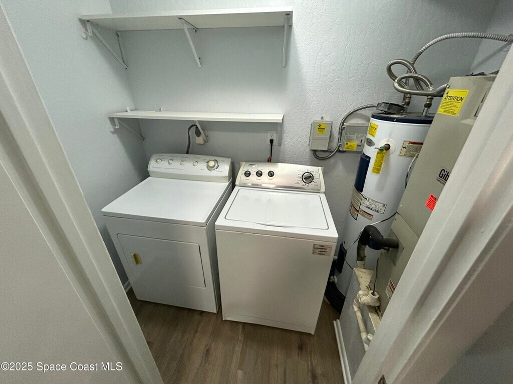 Bright,spacious,and move-in ready this 2-bed,2-bath condo in the desirable Palms Condominium gated community offers comfort,convenience,and value in the heart of Palm Bay. Step inside to an open-concept floor plan featuring a large living area that flows seamlessly to a private balcony,perfect for morning coffee or evening relaxation. The kitchen includes wood cabinetry,a full appliances,while the in-unit washer & dryer add everyday convenience. The primary bedroom features a walk-in closet and ensuite bathroom with double vanities. A spacious second bedroom and bath provide plenty of room for guests,family,or a home office setup. This is a second-floor corner unit with excellent natural light and a peaceful view of the community courtyard and pool area.