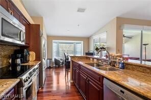 2nd floor 2 bedroom,2 bath condo with wood floors throughout main living area. Great floor plan for entertaining with the kitchen overlooking the family room,breakfast room and screened rear lanai with golf course view. Vaulted ceilings,granite kitchen counters and stainless appliances. Master bedroom has a bay window,walk in closet and attached bath. There is a detached carport with storage area for parking. INTERNET,BASIC CABLE,WATER AND AMENITIES ARE INCLUDED IN THE RENT. Satellite pool is in the cul de sac right next to this condo! Stoneybrook amenities offer something for everyone! Enjoy access to an exercise room,3 community pools,tennis courts,pickleball,volleyball,basketball,bocce ball,a playground,and even a baseball field. The public golf course means you can pay as you play—no membership required. Conveniently located near shopping,dining,I-75,FGCU,beaches,and RSW airport. You're just a short walk to the golf clubhouse,CVS,Publix,Miromar Outlets,and Hertz Arena. With low association fees and a full range of amenities,it’s easy to see why Stoneybrook remains one of Estero’s most popular communities.