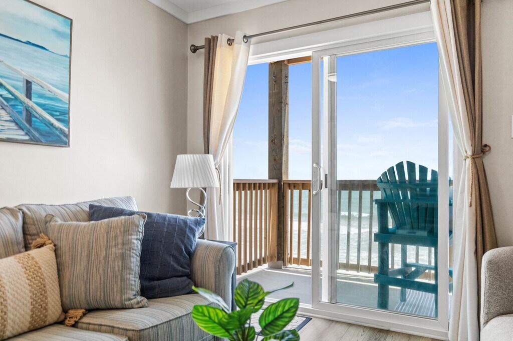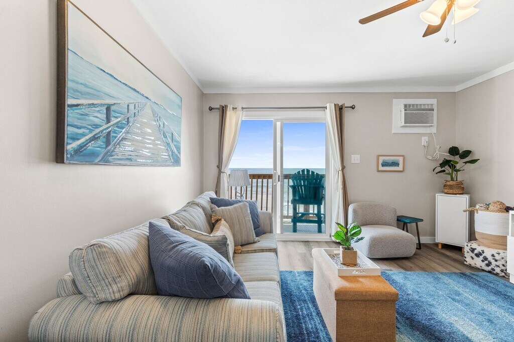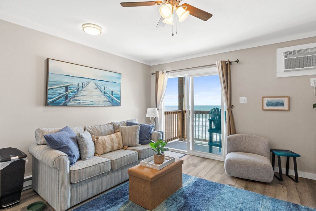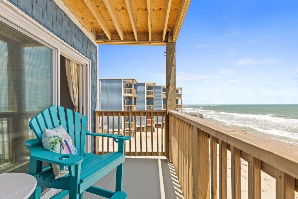 Welcome to Saltwater Sanctum, your second-floor Oceanfront escape at Topsail Reef Condominiums located in BUILDING SEVEN (the second most southern building at Topsail Reef)!! With beautiful custom furnishings this condo offers the ultimate Ocean/Beach front getaway! Begin your day with the calming sounds of the ocean waves where you'll be treated to a breathtaking view of a stunning North Carolina sunrise over the Atlantic Ocean. Delight in preparing a sunrise breakfast in the fully equipped kitchen, complete with a custom-built dining table for four offering a stunning ocean view. Accommodating up to four guests, Saltwater Sanctum features a cozy Queen bedroom suite with a custom-made headboard, and a full-sized sleeper sofa. Enjoy cable TV and wireless internet to stay connected and entertained during your stay. Explore the community amenities like basketball and tennis/pickle-ball courts, and enjoy convenient beach/water access from the condo's stairs. Tiki bar right across the street including a full bar and snacks! Must rent at least 91 days! Lease must end 18 May 2026. NO PETS allowed.