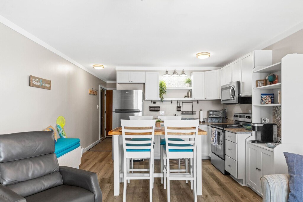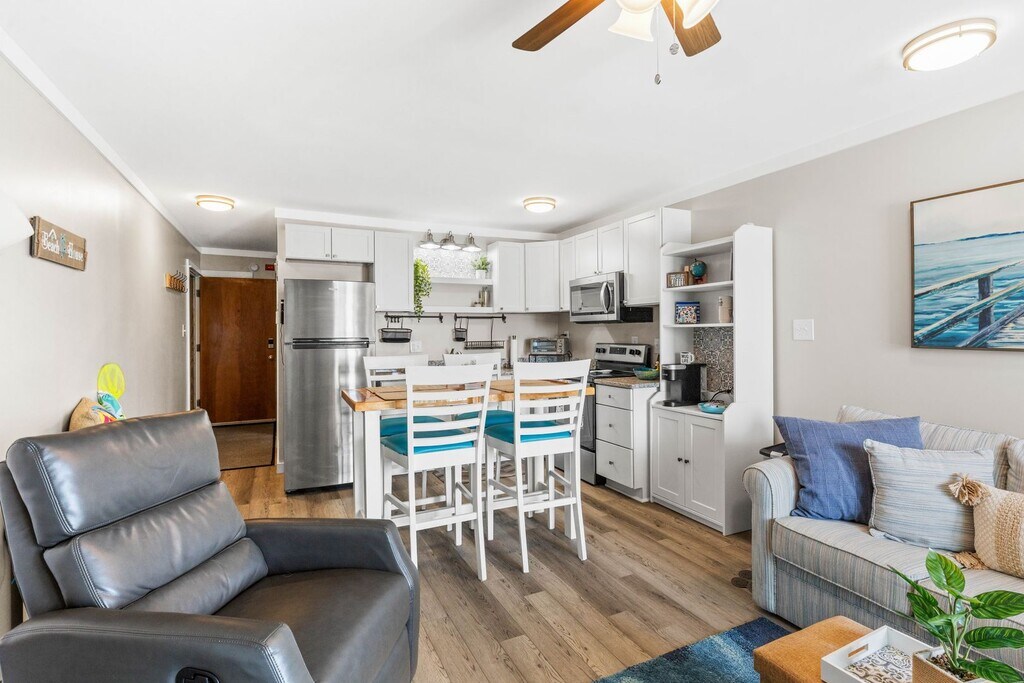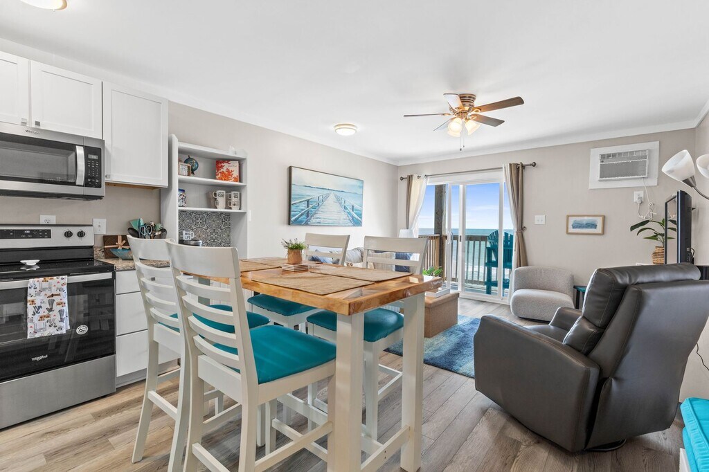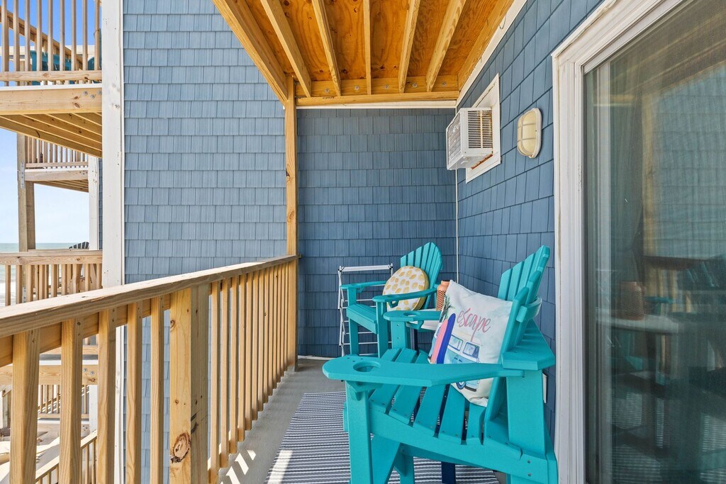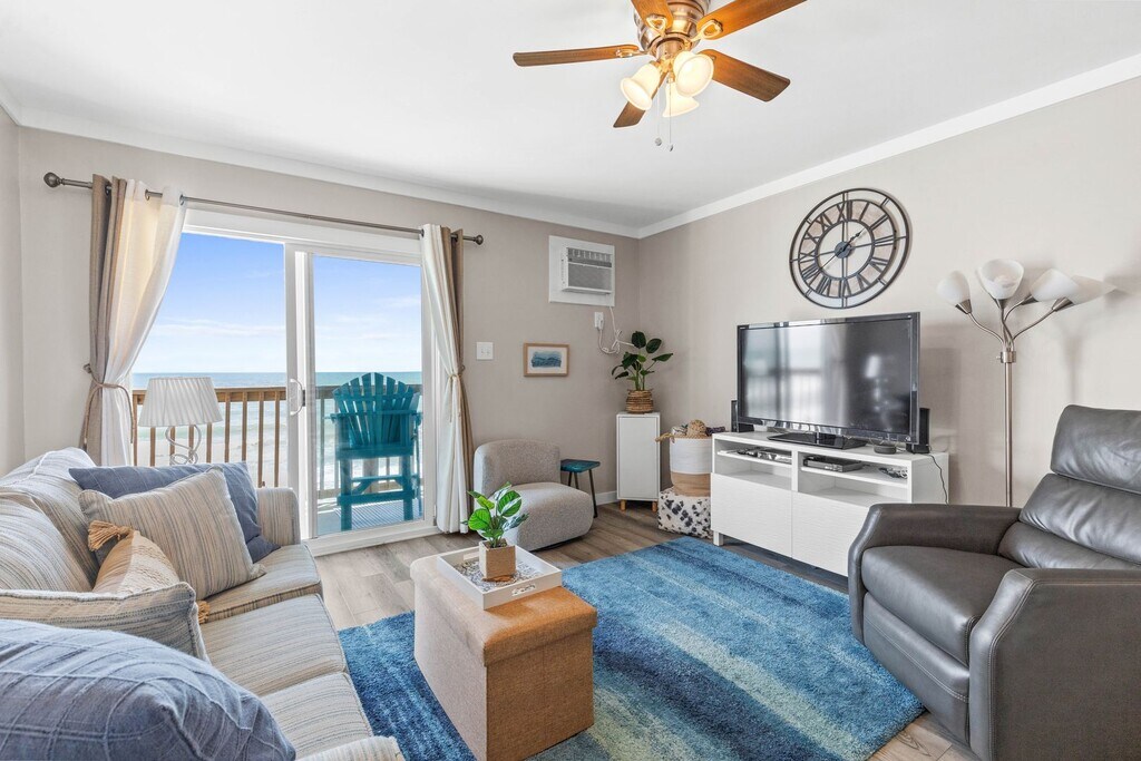 Welcome to Saltwater Sanctum, your second-floor Oceanfront escape at Topsail Reef Condominiums located in BUILDING SEVEN (the second most southern building at Topsail Reef)!! With beautiful custom furnishings this condo offers the ultimate Ocean/Beach front getaway! Begin your day with the calming sounds of the ocean waves where you'll be treated to a breathtaking view of a stunning North Carolina sunrise over the Atlantic Ocean. Delight in preparing a sunrise breakfast in the fully equipped kitchen, complete with a custom-built dining table for four offering a stunning ocean view. Accommodating up to four guests, Saltwater Sanctum features a cozy Queen bedroom suite with a custom-made headboard, and a full-sized sleeper sofa. Enjoy cable TV and wireless internet to stay connected and entertained during your stay. Explore the community amenities like basketball and tennis/pickle-ball courts, and enjoy convenient beach/water access from the condo's stairs. Tiki bar right across the street including a full bar and snacks! Must rent at least 91 days! Lease must end 18 May 2026. NO PETS allowed.
