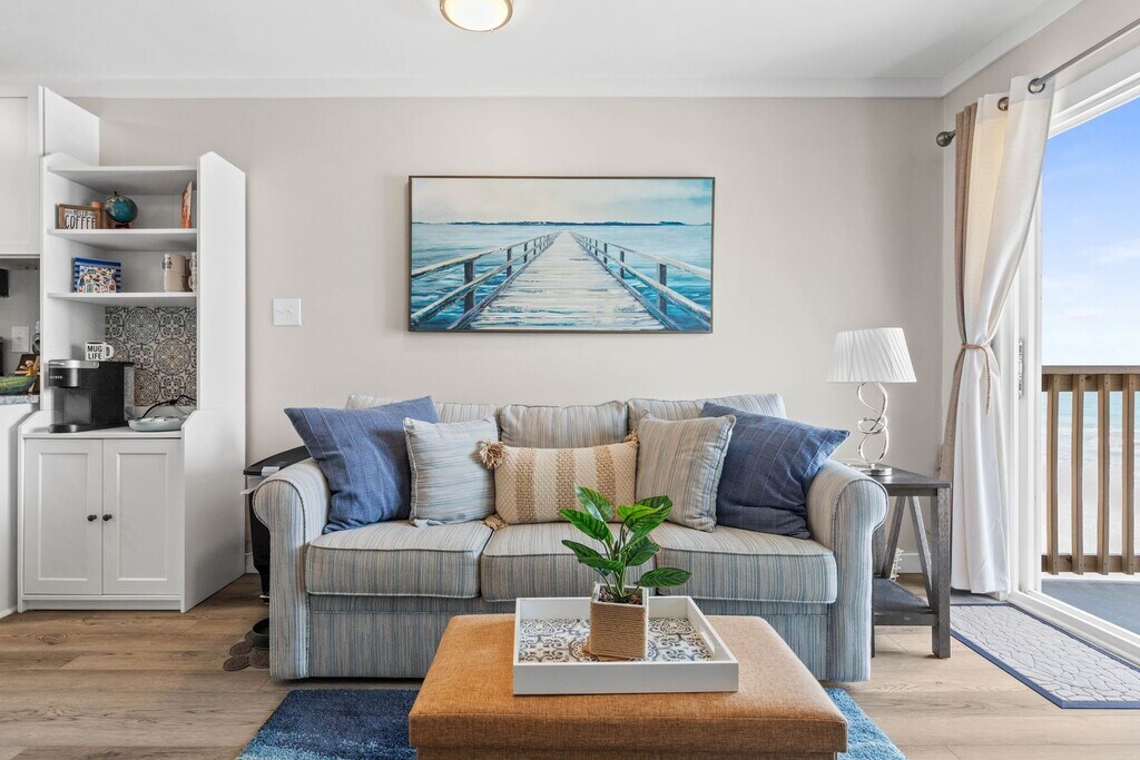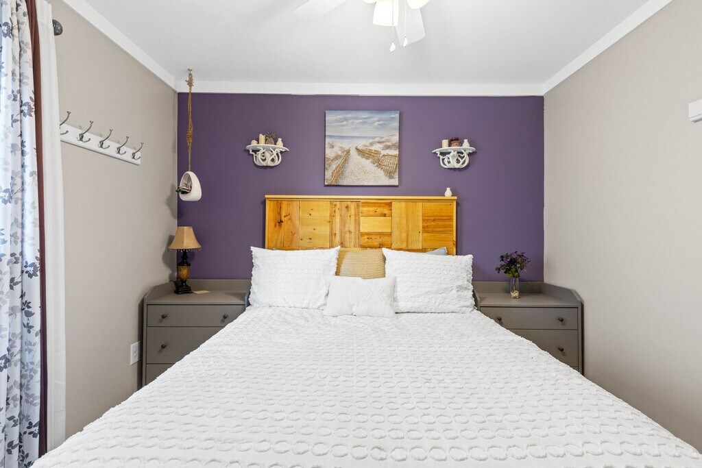 Welcome to Saltwater Sanctum, your second-floor Oceanfront escape at Topsail Reef Condominiums located in BUILDING SEVEN (the second most southern building at Topsail Reef)!! With beautiful custom furnishings this condo offers the ultimate Ocean/Beach front getaway! Begin your day with the calming sounds of the ocean waves where you'll be treated to a breathtaking view of a stunning North Carolina sunrise over the Atlantic Ocean. Delight in preparing a sunrise breakfast in the fully equipped kitchen, complete with a custom-built dining table for four offering a stunning ocean view. Saltwater Sanctum features a cozy Queen bedroom suite with a custom-made headboard. Enjoy cable TV and wireless internet to stay connected and entertained during your stay. Explore the community amenities like basketball and tennis/pickle-ball courts, and enjoy convenient beach/water access from the condo's stairs. Tiki bar right across the street including a full bar and snacks! Available through the winter months. Tenants must rent at least 91 days. NO PETS allowed. UTILITIES INCLUDED