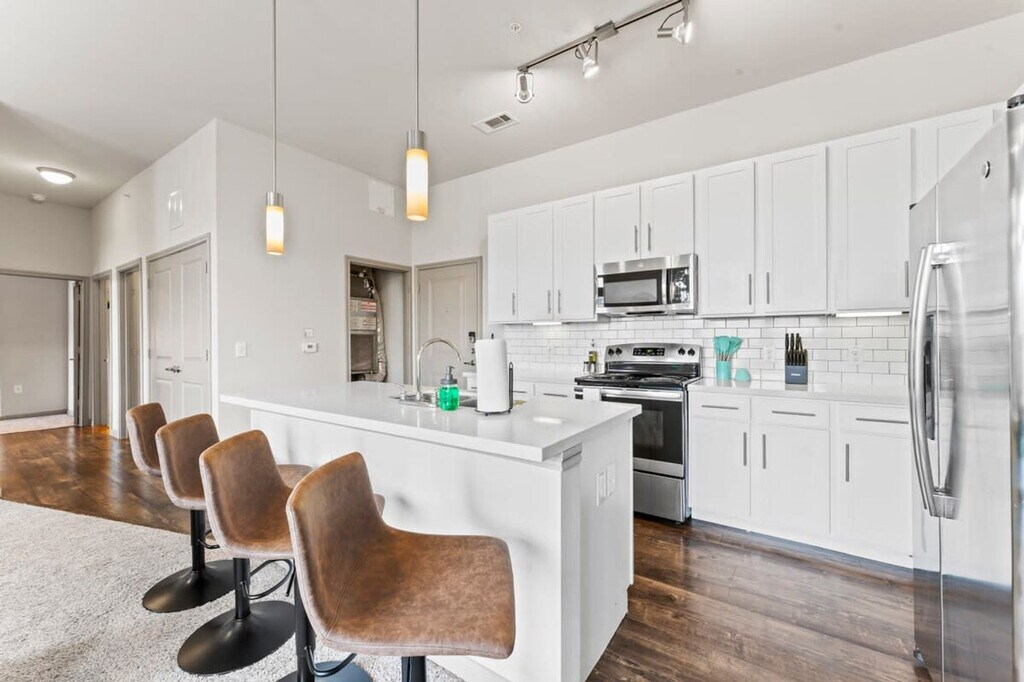 The advertised rate of $3,479/month is the lowest available price, based on a 1 month(s) stay with a move-in date of April 17, 2026. Rates vary depending on the duration of stay, season, and other parameters. For exact pricing and additional pricing components, please visit our website and enter your desired move-in and move-out dates. The rate is applicable when billed upfront; it can be higher if billed in multiple payments. Welcome to your new home in Riverside, a fast-growing and increasingly trendy community right next to Downtown Austin. This 997 sqft 2-bedroom apartment is located on the 1st floor. This home-inspired apartment features a full kitchen, workspace, washer and dryer, and ultra-fast internet. The fully equipped kitchen includes pots and pans, bakeware, dinnerware, silverware, cookware, blender, and toaster. Both bedrooms have large walk-in closets. The spacious bathroom features dual sinks and a tub. Enjoy complimentary coffee and tea with a Keurig machine and pour-over coffee. For entertainment, there is a Roku-enabled 50” smart TV in the living room with complimentary access to live cable (YouTubeTV), Disney+, Amazon Prime Video, HBO Max, Hulu, and ESPN+. Free on-site gated surface lot parking is available. A plush 18" queen-sized air mattress is available. Riverside, also known as East Riverside-Oltorf, is a fast-growing and increasingly trendy community right next to Downtown Austin. Guests can enjoy a scenic view of Lady Bird Lake and the city beyond while taking a walk along The Boardwalk. The neighborhood is home to many artists and musicians whose influences color the community in classic Austin fashion. Visit hotspots like Buzzmill coffee, The Bazaar or Emo’s, one of the most prominent nightclubs in Austin for chart-topping musicians and performers. It's 8 minutes to Downtown (Rainey Street), 14 minutes to Zilker Park (ACL), 6 minutes to Austin-Bergstrom Airport, and 14 minutes to CotA Race Track. Bedroom 2 has a queen-sized bed and was a study space that had been converted into an additional bedroom. Therefore, this bedroom has blackout curtains for privacy separation from the living areas and has no solid door. Smoking, parties, and excessive noise are not allowed, including on balconies and in shared spaces. Smoking violations are subject to a $1,000 fine, which includes the cost to clean, deodorize, and repair damages. Pets are not allowed, and violation of this policy may result in a fine totaling $1,000. Guests who stay beyond their designated checkout time or delay our housekeeping staff are liable for any associated costs and expenses, up to $75 per hour after 10 am. Guests will be charged in full for any damages or for any violations of the house rules. Check-in is at 4 pm and checkout is at 10 am. Guests are responsible for covering the cost, which is $150 per item, to replace lost keys, key cards, fobs, or parking passes. En-suite work stations are available. [SI]