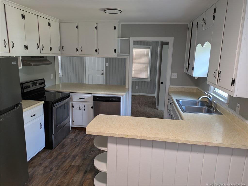 Ranch home with 3 bedrooms, 2 full baths, Kitchen w/appliances, breakfast bar, and dining area. Living room and Family Room w/access to carport. Large laundry room w/sink area. Two car carport w/attached storage area. Large corner lot and fenced.