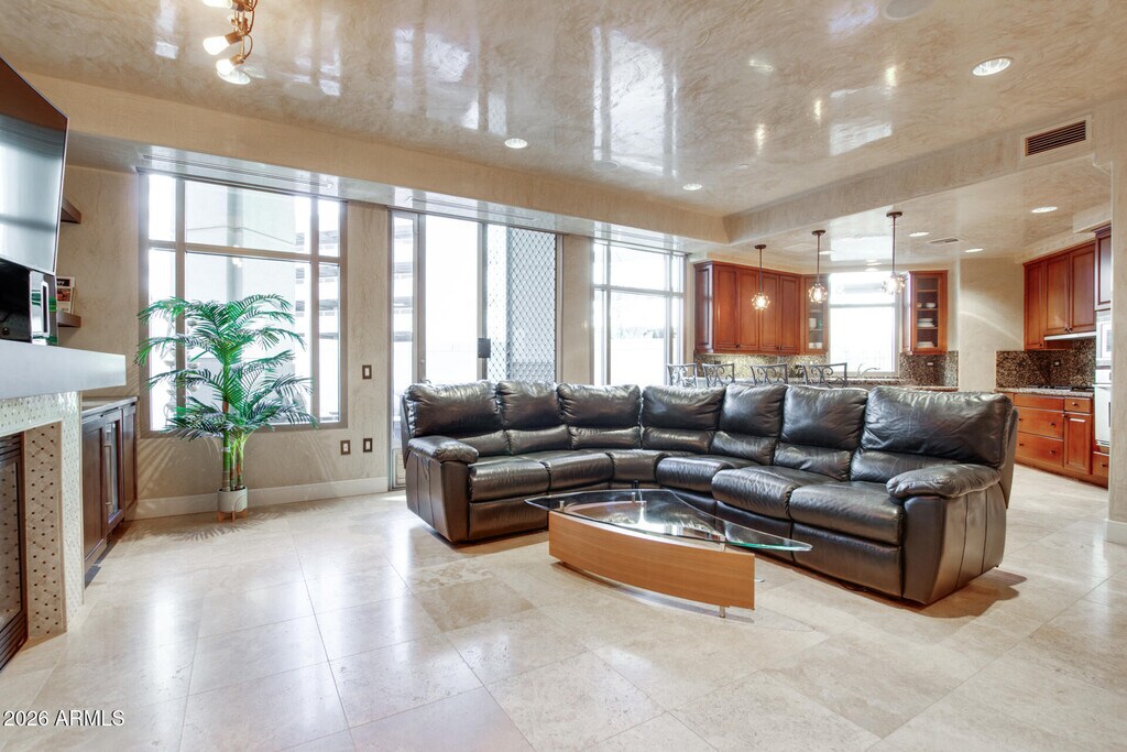 Experience elevated living in this fully renovated 2024 estate in the sky,offering 3,000 sq ft of curated luxury and unobstructed Piestewa Peak views. This 2-bedroom + den (optional 3rd bedroom),3-bath residence features herringbone natural walnut flooring,floor-to-ceiling windows,and a dramatic Carrara marble fireplace in the living area. The show-stopping chef's kitchen boasts custom walnut cabinetry,Italian leathered marble countertops and backsplash,a Crate & Barrel French-style island,and premium appliances including a Monogram 6-burner gas range,Signature Suite column fridge/freezer,integrated wine cooler,and a fully equipped wet bar. The primary suite offers mountain views,a Carrara tile shower and tub surround,freestanding soaking tub with Brizo hardware,Restoration Hardware vanities with Ashley Norton hardware,and a heated TOTO bidet toilet. The hall bath is equally refined with a Sherle Wagner granite vanity,custom black marble shower,and octagonal leathered black marble flooring. Additional features include custom LED lighting,California Closet systems,vintage and designer light fixtures,and a repurposed 19th-century Parisian mirrored window wall. Residents enjoy access to 24-hour security,valet,concierge,rooftop pool,fitness center,clubroom,2 garage spaces,and a private storage unit. Located in the heart of the Biltmore,steps to premier shopping and dining,and just minutes to Sky Harbor,Downtown Phoenix,and major highwaysthis is Arizona luxury living at its finest.