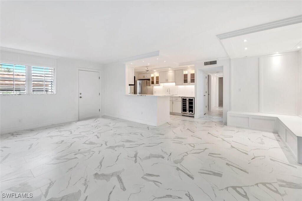 BOOKED FOR 2026!! 90-day min. This one-of-a-kind,professionally designed residence with spectacular Moorings Bay views,is just a short walk over to a sandy,white pristine beach and Gulf of Mexico! A wonderful location to walk or bike to the Venetian shops,galleries and restaurants,and a short drive to the Olde Naples epicenter. Residents of The Moorings find themselves only moments from the very best attractions Naples has to offer. The expansive floor plan affords plentiful areas to entertain while still offering a large,private master suite,as well as an additional guest bedroom and full bathroom. As soon as you walk through the front door,you will find an inspiring main living area with abundant natural light,white quartz countertops,solid wood cabinetry,stainless steel appliances,5-inch custom architectural shutters,raised ceilings,and custom mill-work throughout. The living area offers a large comfortable couch,2 comfortable leather swivel chairs,flat-screen TV. and whimsical art. The Kitchen is well stocked,has a large island,kitchen table/seating and opens out to the living area for easy entertaining. The dining table seats six. The Master Suite offers a king-size bed,walk-in closet,large flat-screen TV and private bath with a spacious walk-in shower. The Guest Bedroom has a queen-size bed,flat-screen TV,spacious closet and bath with a shower. The sugar sand Gulf beaches are only a short five-minute walk away,and the pool with a renovated indoor/outdoor kitchen is just steps from your front door. Located near Old Naples cultural epicenter,as well as upscale dining and world-class shopping at Venetian Village,residents of The Moorings find themselves only moments from the very best attractions Naples has to offer. Several generous direct Gulf-access boat slips are available for lease. A short walk to the beach and minutes away from the Venetian Village for dining,shopping and galleries.
