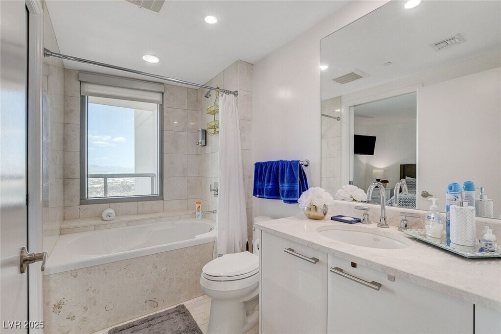 A Rare One-of-a-Kind Turnberry Towers Luxury Condo, located on the 33rd floor with views of the spectacular strip city and mountain from every angle. There is no other like it! This fully furnished, designer-upgraded 1,399 sq. ft. residence features two beautifully furnished private balconies for true outdoor living, a new custom fireplace, and an upgraded chef’s kitchen built to impress. The spa-inspired primary suite features its own balcony, a Jacuzzi tub, and an oversized walk-in shower. Resort-style amenities complete the experience, including a cascading pool and spa, tennis & pickleball courts, a putting green, a state-of-the-art fitness center, a dog park, a 24-hour concierge, and valet parking. For peace of mind, enjoy 24-hour guard-gated security. This is a true turnkey masterpiece in the heart of Las Vegas, just bring your toothbrush and clothes.