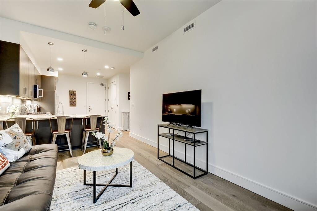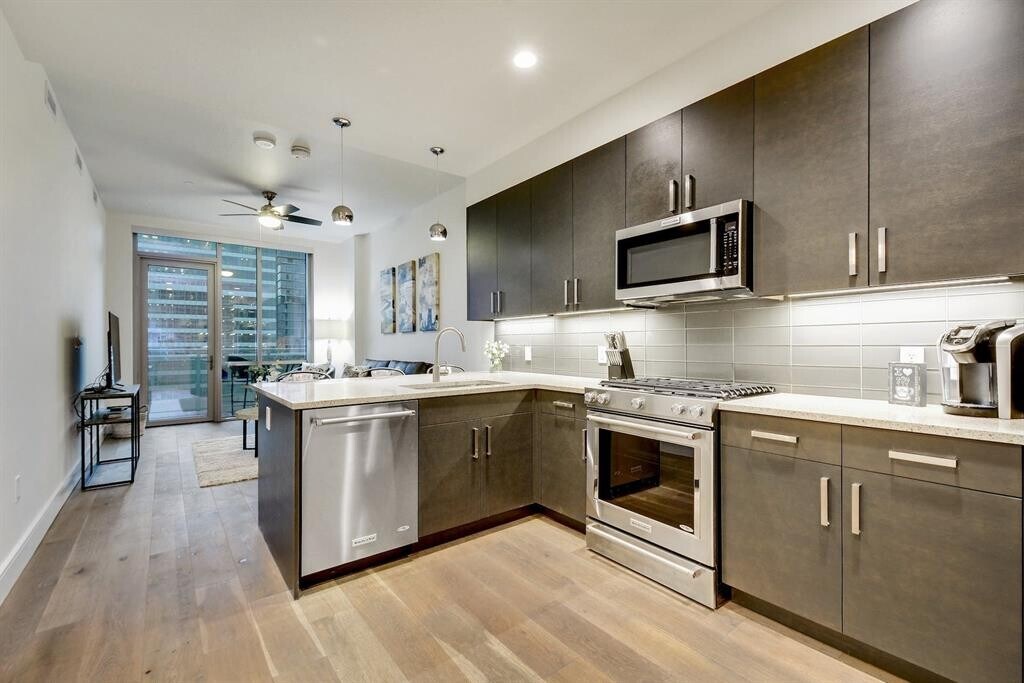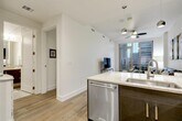 Live in the heart of Downtown Austin at Seaholm Residences in this beautifully appointed condo, featuring a private balcony with sweeping views of the city skyline. Inside, you'll find stylish wood floors throughout, granite countertops, and double vanities in the spacious bathroom. The walk-in closet offers plenty of storage, making everyday living both comfortable and convenient. Enjoy access to a full suite of luxury amenities, including a 24-hour concierge, fitness center, resort-style pool, BBQ grill, courtyard, dog park, clubhouse, and more. Whether you're looking to relax, entertain, or explore, this location puts you steps away from everything Austin has to offer.