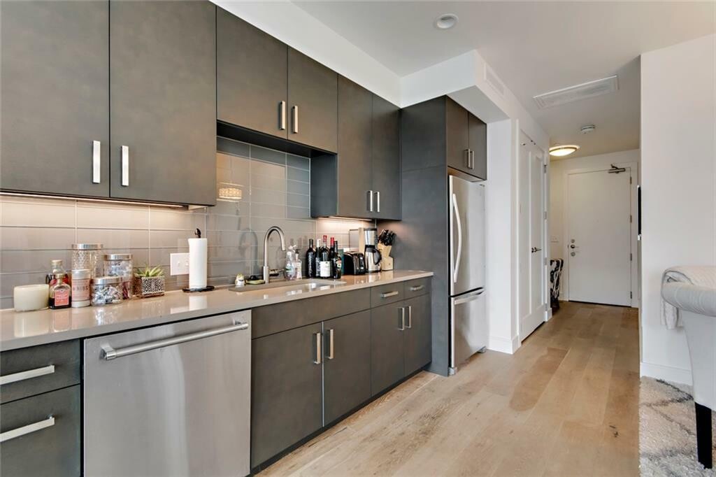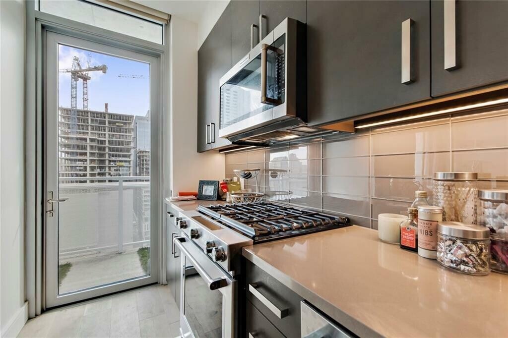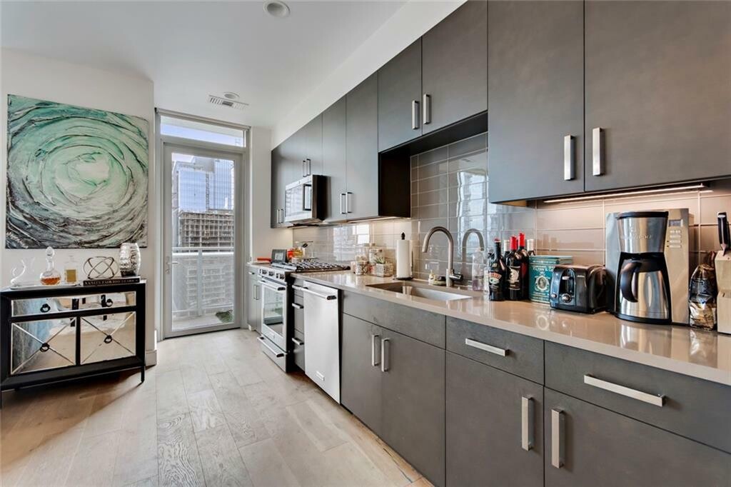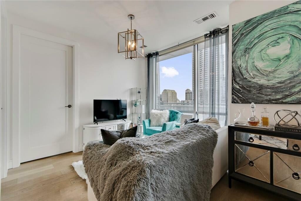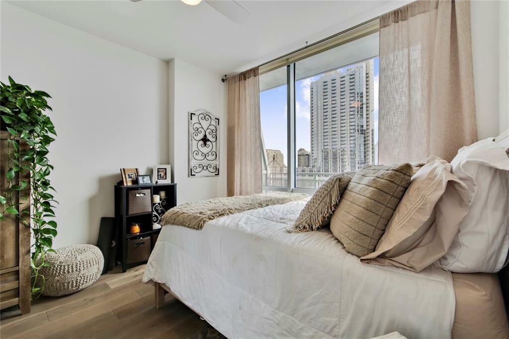 Take in incredible views through the floor-to-ceiling windows, wood floors and relax with your morning coffee in-hand on the generously sized balcony. Treat yourself to the amenities sky deck which includes a heated pool, grills, dog park, dog washing station, business center, clubroom, &; fitness center. Added extras include solar window blinds, and custom drapery rods, with upgraded fridge. The washer washer/dryer is also included. One thing you are surely to appreciate is the highly convenient 1st level parking spot by door. Not in the mood to cook tonight? You are close to everything, head to the ground floor &; let True Food Kitchen do the cooking for you. Close to Trader Joe’s, Whole Foods, Lady Bird Lake, Hike &;; Bike Trails, and the DT library!
