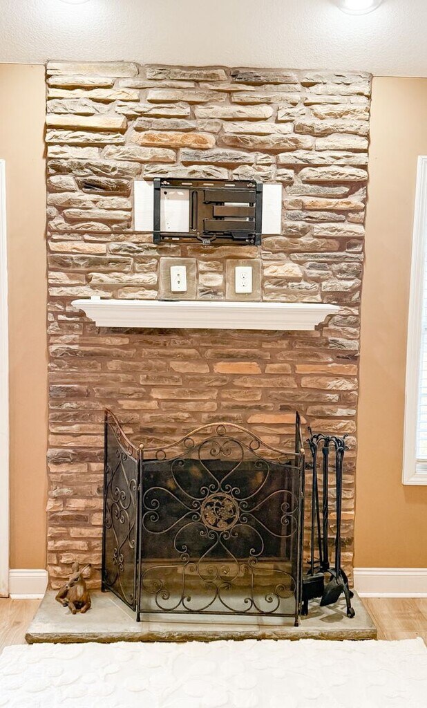Ready Now! One story handicap accessible home, three bedrooms two baths, 14 73 ft.² with open floor plant. Master bedroom has separate bath with shower and large tub and walk-in closet and double vanities. Dining area off kitchen and laundry room is also off kitchen between kitchen and garage. Central heat and air. All new laminate flooring no carpet carpets. Large two car garage and extra large backyard with grass. Fireplace in living room area.. I would probably put my couch that goes around in here TV. I don’t know how to arrange this room put a couch there circle around that way.