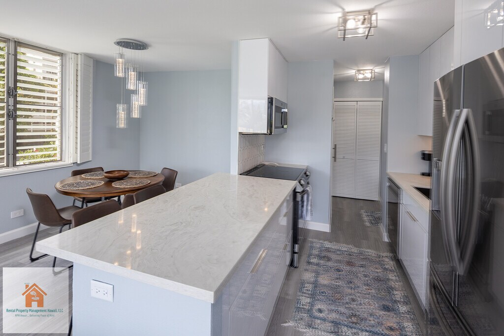 You will love the luxury this amazing retreat offers with golf course, canal, and mountain views from the comforts of your home! This extra large one bedroom end apartment offers plenty of natural lighting and was completely remodeled this year with thoughtful upgrades and finishes: Stainless steel appliances, luxury vinyl flooring, quartz countertops, new kitchen and bathroom fixtures, even the mirrors have lights and built-in technology. The large living area and extra half bathroom makes this apartment ideal to entertain guests or enjoy all to yourself. There is a large window AC unit to cool the home if needed, however, the corner unit allows for the cool trade winds to blow through most days. With a walk score of 90 out of 100, it's conveniently located near schools, bus lines, beaches, shopping, and restaurants. This home is available now and ready for you to occupy. Move right in as it is fully furnished down to the kitchenware, towels, and linens. This is a well-managed, secure building with guest parking. The apartment comes with one assigned parking space. Utilities Included: Electricity, Sewer and Water, Cable and Internet. Available November 1, 2025 for a 3-month minimum. Tenant must pay the general excise and transient accommodations (less than 6-month lease) tax on the rent which is currently an additional 4.712% and 13.25% respectively as well as professional cleaning fee. Security deposit is equal to one month's rent. Application Fee: $45. One small dog may be allowed. No cats. No Smoking in or within 20 feet of the property. Transient Accommodations (TAX ID) TA--01 For showings contact Matt: Matt Brummel, RB-22145 Rental Property Management Hawaii, LLC RB-23207