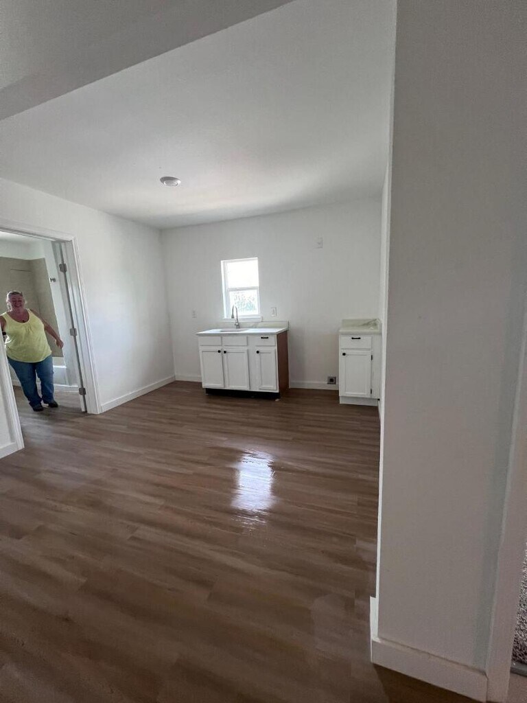 Welcome to this bright and modern living space, featuring high-quality finishes and an open layout perfect for contemporary living. The apartment boasts a modern aesthetic with freshly painted white walls, bright trim, and abundant natural light throughout. The main areas are grounded by beautiful, warm wood-look plank flooring that flows seamlessly through the kitchenette, living area, and bathroom. A separate bedroom offers a more comfortable retreat, featuring plush dark carpeting and a built-in closet with white bi-fold doors. The sleek kitchenette is compact yet functional, outfitted with white Shaker-style cabinetry, modern countertops, and benefits from a window for natural light above the sink. The spa-like bathroom is equally refined, featuring a chic grey Shaker-style vanity, a clean white toilet, and a bathtub surrounded by designer taupe tile in the shower area, complemented by modern fixtures and recessed ceiling lighting throughout the unit. This apartment offers a pristine, move-in ready environment!