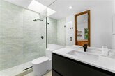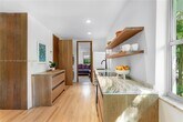 South of Fifth Beach Bungalow located on a premiere quiet block, nestled in a lush tropical botanical garden. This 1BD/2BA, 922 SF sanctuary blends natural textures with modern design. Warm white oak floors and Ipe wood walls create a serene, organic backdrop accented by Italian custom-built furniture and décor. The kitchen is a showpiece, featuring green marble counters, floating cabinetry, Blanco sinks, and a Fulgor Milano oven. The blue Spanish-tiled bathrooms with skylights evoke coastal Mediterranean charm, while the LG laundry area and Whirlpool dishwasher add everyday convenience. Experience true Miami Beach living in the heart of SoFi: a coveted area that is just steps to world-class dining and the beach.