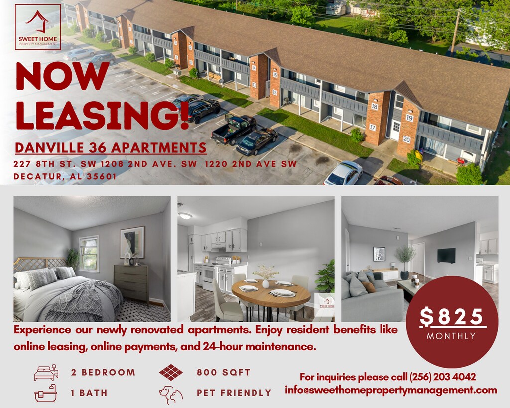 MOVE-IN SPECIAL! Sign a lease this November and get $300 OFF your first full month’s rent! Newly Renovated 2 Bedroom Apartments in Decatur, AL Enjoy modern finishes, spacious layouts, and easy access to shopping, dining, and recreation. Community Perks: Online leasing & payments 24-hour smart maintenance Pet-friendly & smoke-free ***$50 water billback ***Paint and flooring may vary by unit.