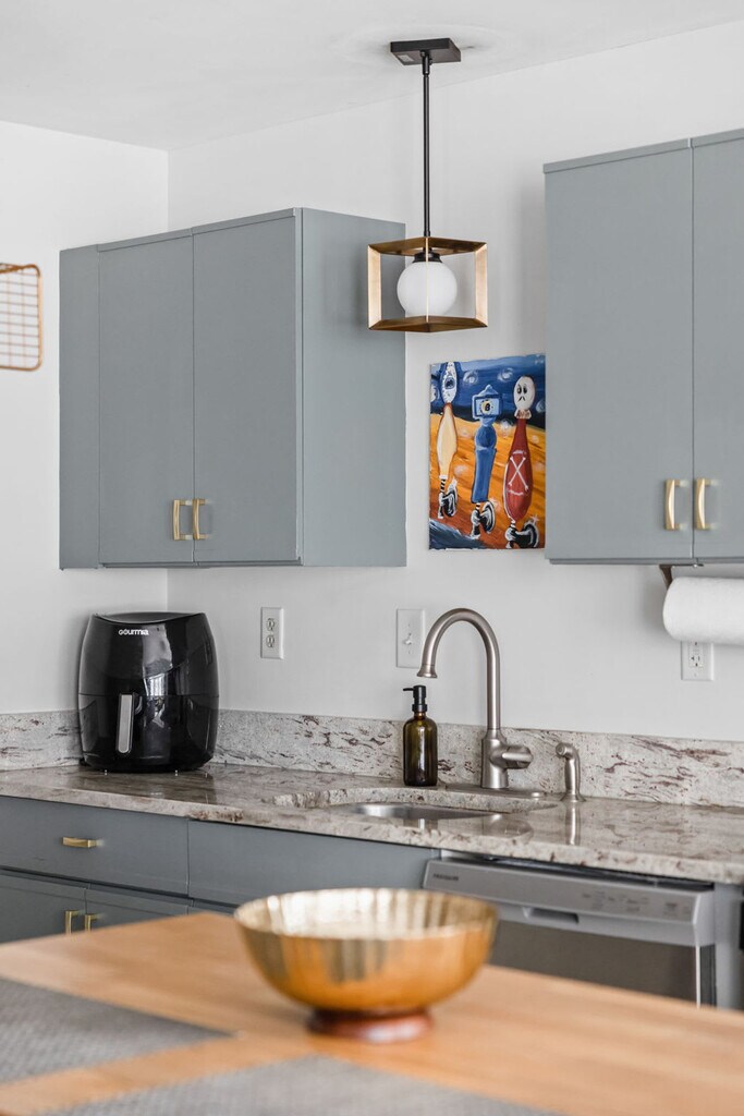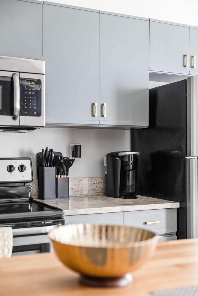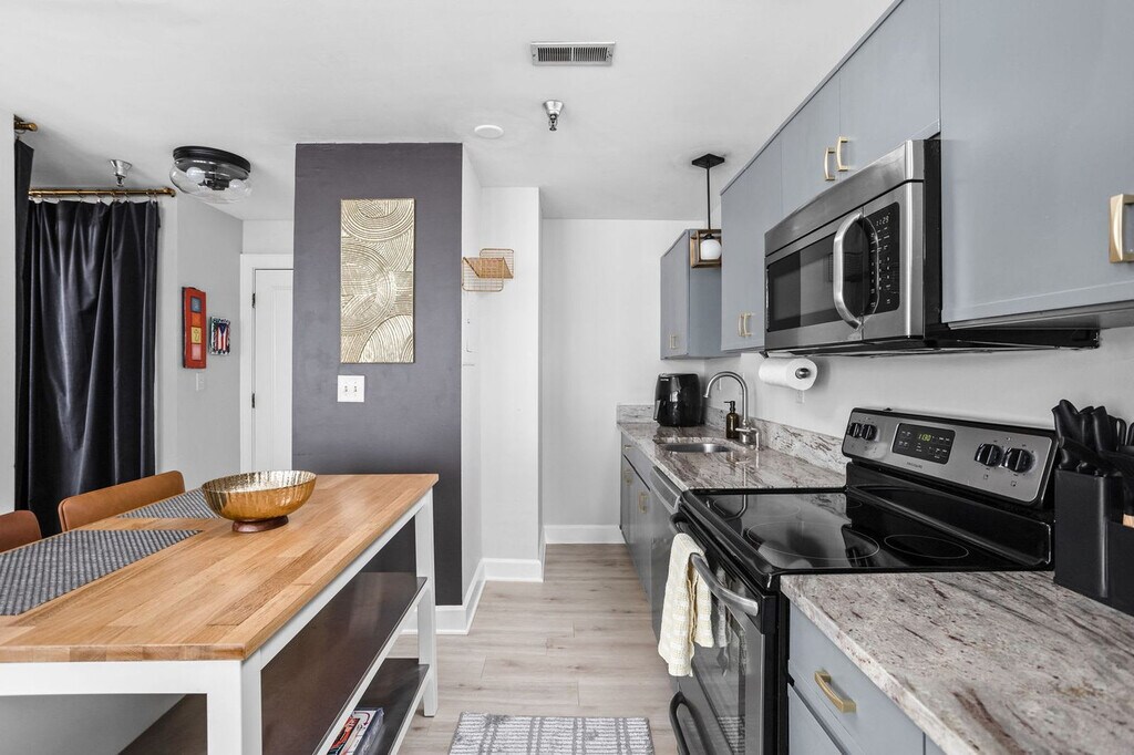The fully- and newly-furnished cozy apartment is ready for you to move in, featuring beautifully decorated soothing colors of aqua, teal, gray, and white. Designed perfectly for anyone moving across the state, country, or internationally for school or work, it has everything you need. (ALL UTILITIES INCLUDED)(ASSIGNED PARKING SPACE) You’ll walk into a fully-stocked kitchen complete with dishes, eating utensils, and cooking utensils, along with ceramic cookware, mixing bowls, measuring cups and spoons, muffin cups, and even oven mitts. If you need additional tools like a can opener or vegetable peeler, it’s all here, along with basic spices stored neatly in a built-in spice drawer. The living room is cozy with a chenille loveseat and several ottomans for seating and storage. Plus, there’s a TV with a firestick for your entertainment needs. For those overnight guests, there’s a convertible chair that turns into a twin bed! In the bedroom, you’ll find a full-size bed with all bedding provided and another TV ready for your enjoyment. There’s ample storage as well with drawers under the bed and a lighted closet complete with hangers and essentials for your convenience. The bathroom has all the necessities stocked, including soft microfiber towels and a hair dryer for a smooth start to your day. Imagine hosting a fireworks-watching party in your living room next July 4th with amazing views of downtown Indianapolis!