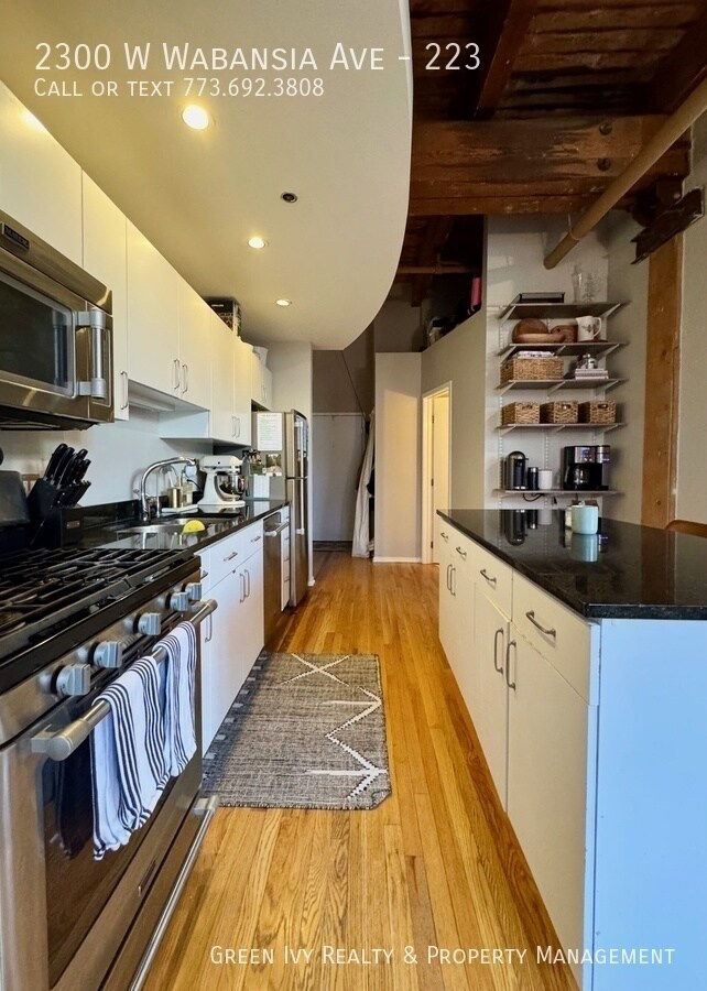Welcome to Bucktown's Clocktower Lofts! This spacious 2-bedroom, 1.5-bathroom loft features a great open floor plan with hardwood floors throughout. The updated kitchen provides a stainless steel appliances, sleek white cabinets, and a kitchen island. The living room offers a large fireplace, space for a dining table and a balcony overlooking the courtyard. Both bedrooms are generously sized and provide ample closet space. This beautiful layout is currently featured in Apartment Therapy: Clocktower Lofts is an elevator building offering a rooftop deck, fitness center, underground parking garage, and additional storage. It is conveniently located steps from the 606 and the Damen and Western Blue Line. HOA fees apply. Tenants are responsible for gas and electricity. Cable and internet access included in rent. Brand new washer and dryer in unit. One assigned garage parking spot included in rent. One assigned storage locker included in rent. Pets ok, max 2 (HOA restrictions apply). Available June 1st! Please call or text with questions or to schedule a showing. Green Ivy Property Management