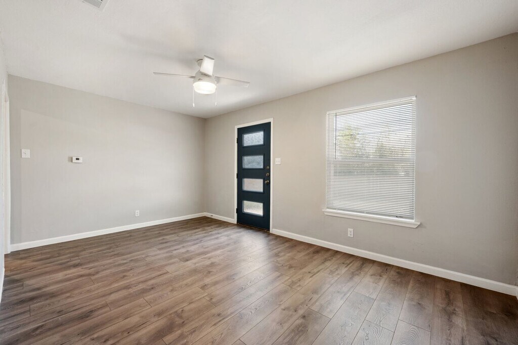 Tenant Move-In Special - 6 weeks free rent!! Welcome to this stylishly remodeled 2-bedroom, 1-bathroom duplex, ready for you to move in! Highlights include a sleek all-white kitchen with a beautiful accent backsplash, low-maintenance wood flooring throughout, & new light fixtures. Enjoy the private fenced backyard and the convenience of being just 5 miles from downtown Austin. With easy access to Ben White, E Riverside, and IH 35, this location offers unmatched convenience.