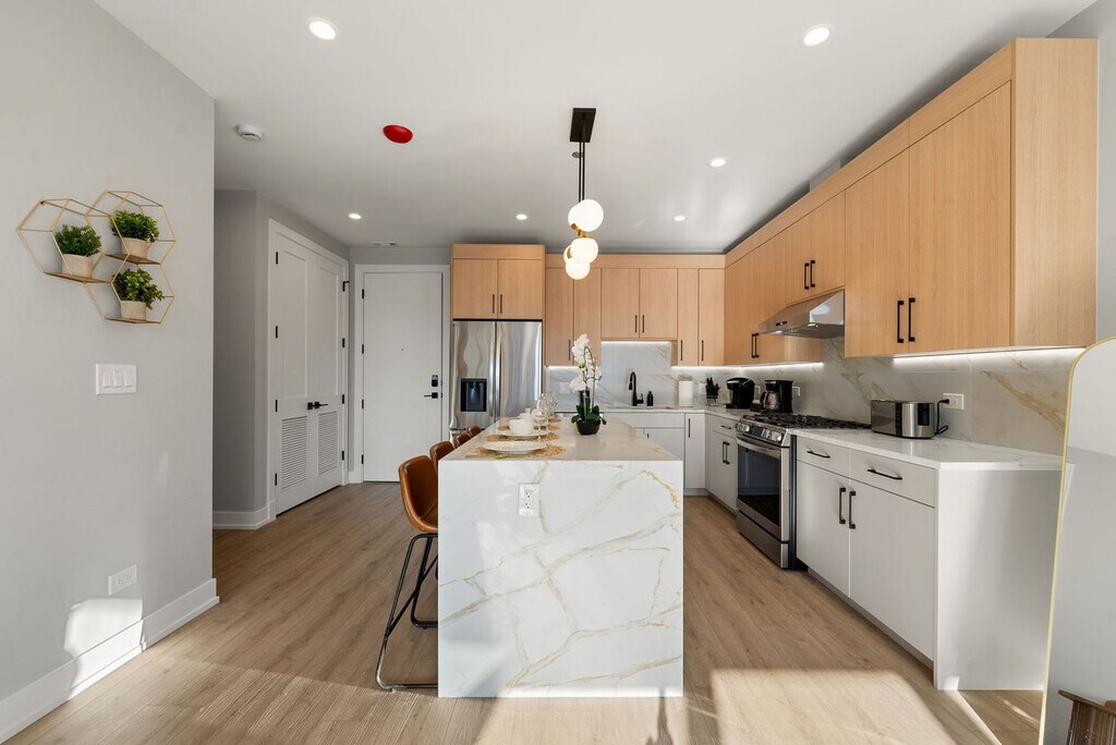 Experience upscale city living and feel at home in this stylish 2-bedroom, 2-bath apartment located in Chicago’s vibrant Tri-Taylor neighborhood. This modern retreat features sleek interiors, spacious bedrooms, a fully equipped gourmet kitchen, and designer finishes throughout. Enjoy high ceilings, large windows, and smart amenities. The open-concept living area welcomes you with its abundance of natural light and stylish furnishings. A large flat-screen TV with cable channels is available for your entertainment needs. The fully equipped kitchen features sleek countertops, modern appliances, and ample storage space. Enjoy your culinary creations at the elegant dining table, or step out onto the private balcony and relish in the fresh air and city views. The master bedroom features an en-suite bathroom with a sleek shower and premium bath products. Enjoy a rooftop with Chicago skyline views. This apartment is minutes from downtown, the United Center, and the Illinois Medical District. It is located in Chicago’s Tri-Taylor neighborhood, part of the broader Near West Side community, just west of the Illinois Medical District and close to the University of Illinois at Chicago (UIC). The neighborhood features a mix of historic brick two- and three-flats, quiet tree-lined streets, and newer developments. Tri-Taylor is known for its proximity to the historic Little Italy district along Taylor Street, home to old-school Italian restaurants, cafés, and bakeries. Public transit is convenient and well-connected, centered around the CTA Pink Line’s Polk Station, just a block away. Several CTA bus routes, including the #7 Harrison, #157 Streeterville/Taylor, and #12 Roosevelt, also run nearby, providing easy east-west access and connections to other train lines and neighborhoods. The area is highly walkable and transit-friendly, making it ideal for commuting to the Illinois Medical District, UIC, or downtown. Quiet hours are between 10:00 PM and 8:00 AM. There is a $1,000 fine for parties or events, a $500 fine for smoking inside the apartment, and a $500 fine for tampering with noise monitors or cameras. The primary guest must be 25 years or older to book. To abide by all legal requirements and building security rules, you will be asked to provide a copy of your official government-issued photo ID, confirm your contact information, and provide a valid credit card with a name that matches your ID. Check-in time is 4:00 PM, and check-out time is 11:00 AM. There are cameras outside of the home for your safety that will be recording during the reservations. Registration Number: R2 [SI]