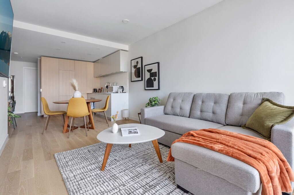 This spacious and stylish one-bedroom unit is the perfect home base in Vancouver's vibrant Chinatown. With brand-new furniture, a king-sized bed, and all essentials included, it's ideal for professionals, relocators, or anyone seeking comfort and convenience in a dynamic neighborhood. Features: Fully furnished with modern, tasteful décor King-sized bed with luxury linens Fully stocked kitchen – cookware, dishes, small appliances Fresh towels, linens, and bedding provided Dedicated work-from-home desk Private patio for relaxing outdoors Secure underground parking space just across the street Building Amenities: Tranquil courtyard garden Expansive rooftop patio with panoramic views of downtown and the North Shore mountains Secure bike storage lockers Indoor amenity room for gatherings or meetings Location Highlights: Steps to SkyTrain and major bus routes – easy access to all of Metro Vancouver Surrounded by cafes, restaurants, local markets, and cultural landmarks Minutes from Gastown, Downtown, and False Creek Terms: All utilities included – heat, electricity, water, and high-speed WiFi Pet-friendly with deposit Minimum 90-day rental This thoughtfully designed unit is move-in ready – just pack your suitcase and settle into one of Vancouver's most unique and historic neighborhoods.