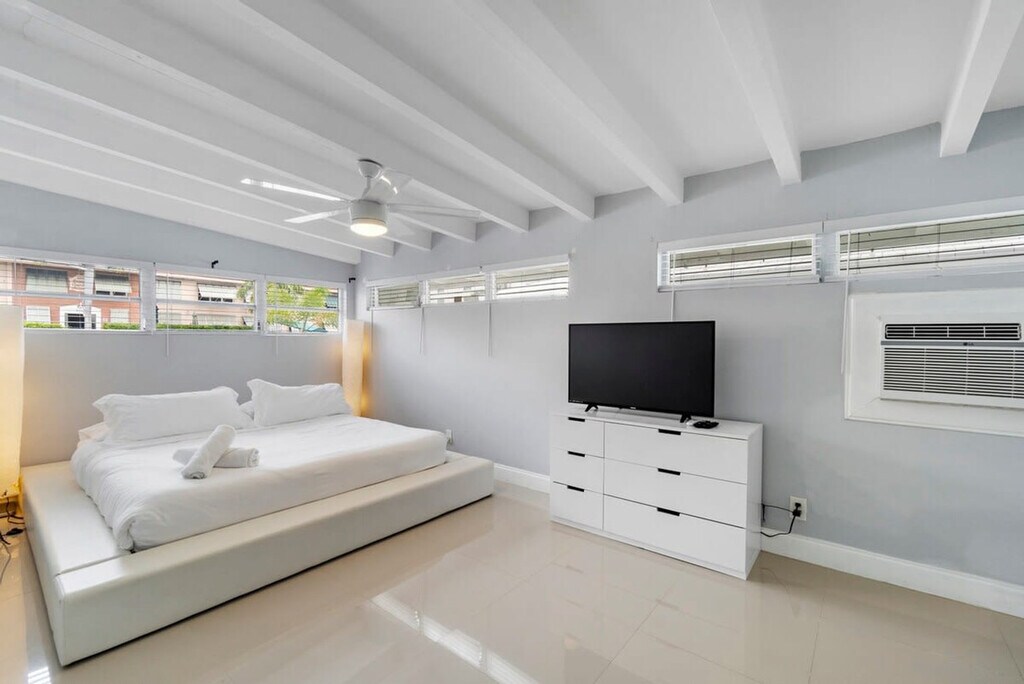 Welcome to the Sandbar, your dream vacation destination in sunny South Florida! This 3-bedroom, 2-bathroom unit offers everything you need for a memorable stay. Feel at home as you enjoy the shared pool or take a short two-block walk to the stunning Fort Lauderdale Beach. With high-end appliances and a fully equipped kitchen, this apartment comfortably sleeps your entire family. The Sandbar unit is part of "Palm Paradise Inn- the Beach," which consists of three units sharing a pool and a spacious backyard. Enjoy the privacy of your unit or mingle with new friends in the common areas. The apartment features an in-unit washer and dryer, making it convenient for longer stays. The fully equipped kitchen is perfect for preparing home-cooked meals or big family breakfasts. Pets are welcome with a fee of $125 per stay. We kindly ask that pets are kept off the furniture, and crate-trained pets are preferred. Free parking is available for your convenience. Nestled in the vibrant North Fort Lauderdale Beach area, this apartment is just a 5-minute drive from the famous Fort Lauderdale Beach and 10 minutes from Lauderdale by the Sea. The neighborhood is walkable and bike-friendly, with nearby attractions like Cafe Martorano and Coral Ridge Mall, which is a 7-minute drive away. While a car is recommended for exploring South Florida, many local spots are easily accessible on foot or by bike. This property consists of three units, with the backyard, grill, and pool being shared spaces. The apartment is private and exclusive to you. There are no parties, no unregistered guests, and no smoking allowed anywhere on the property to maintain a family-friendly environment. Exterior cameras are located at the main entrance, side gate entrance, and pool for safety, but there are no cameras inside or facing into your unit. The pool is heated to about 20 degrees above ambient temperatures, with a maximum of 85 degrees. Please consider this if booking during Florida's colder months. [SI]