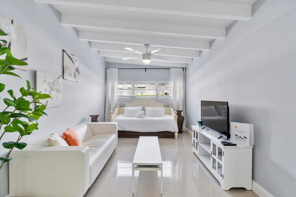 Welcome to the Coconut room at Palm Paradise Inn, the perfect spot for a quick getaway in Sunny South Florida. This one-bedroom apartment is just a 5-minute walk from Fort Lauderdale Beach and offers a fully stocked kitchen, a king-size bed in the bedroom, and two single beds in the living room, comfortably sleeping four guests. Enjoy the shared pool and large backyard outdoor space, complete with lounge chairs, outdoor seating, and a fire pit. The Coconut unit features a full kitchen and a cozy living room, providing a comfortable space for relaxation. The shared outdoor area includes multiple seating and lounge areas, as well as a grill for the ultimate cookout experience. Enjoy floating in the pool or take a short walk to the beach with provided beach chairs. Pets are welcome with a fee of $125 per stay. We kindly ask that pets are kept out of the pool and off the furniture, with crate-trained pets preferred. Free parking is available for guests, and a washer and dryer are located behind Unit 2 for your convenience. Located in the vibrant North Fort Lauderdale Beach area, this apartment is just a 5-minute drive from the famous Fort Lauderdale Beach and a 10-minute drive to Lauderdale by the Sea. The neighborhood is walkable and bikeable, with nearby attractions like Cafe Martorano and Coral Ridge Mall, which is a 7-minute drive away. While a car is recommended for exploring further, local amenities are easily accessible on foot or by bike. This property consists of three units, with the backyard, grill, and pool being shared spaces. The apartment is private and exclusive to you. No parties, no smoking, and no unregistered guests are allowed on the property. Exterior cameras are installed for safety, and the pool temperature is subject to ambient conditions. The primary guest must be at least 25 years old to book this property. [SI]