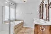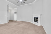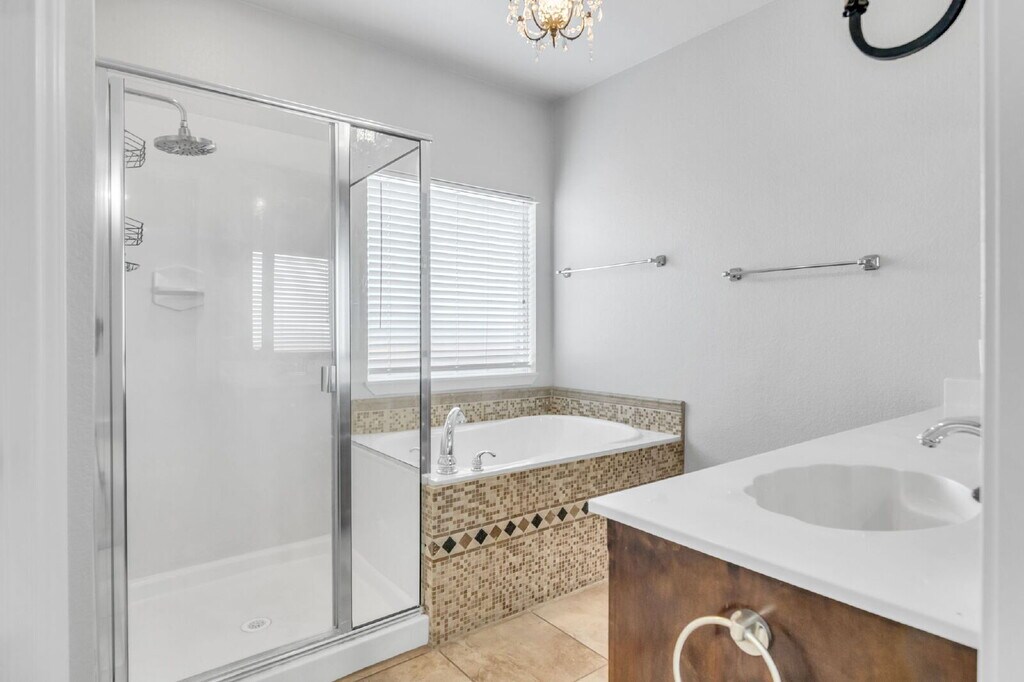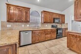 Welcome to this inviting 4-bedroom, 2-bath home, featuring a neutral palette and decorative lighting throughout. The open living area is anchored by a modern fireplace, creating the perfect gathering space. The large kitchen is a standout, featuring granite countertops, a breakfast bar, and abundant storage—perfect for everyday living and entertaining. The spacious primary suite offers a relaxing retreat with a generous walk-in closet, a sleek glass shower, and a garden tub accented with mosaic tile. Three additional bedrooms feature durable wood-look tile and share a second bathroom with an extended vanity for added functionality. A dedicated utility room with a handy drip-dry area adds to the home’s thoughtful design. Outside, enjoy a cozy backyard with a covered patio ideal for outdoor dining, lounging, or unwinding after a long day. This home combines comfort, style, and practicality in a move-in ready package.