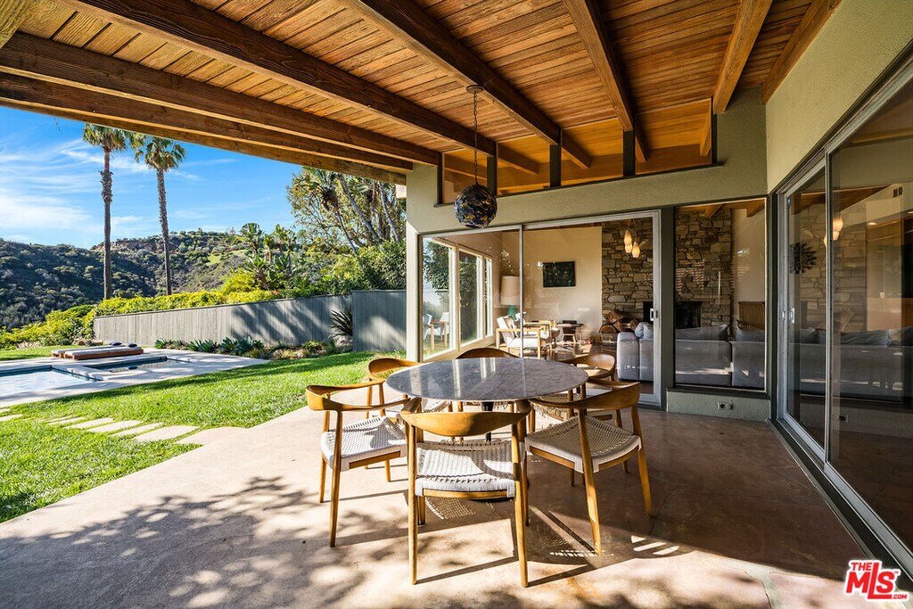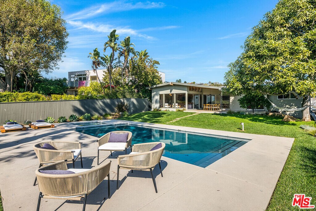 Stunning Mid-Century retreat in prime Outpost Estates, set on a quiet cul-de-sac moments from Runyon Canyon. This private Hollywood Hills escape offers sweeping city views, a beautiful pool with spa, and an expansive flat yard, an ideal indoor/outdoor setting for relaxing or entertaining. A spacious living and dining area showcases an open floor plan with classic 1950s architectural details and walls of glass that frame the views. The remodeled chef's kitchen features all-Miele appliances, Ann Sacks tile, and sleek electronic touch-open cabinetry. The home offers 3 bedrooms and 3 bathrooms, including two generous primary suites, each designed for comfort and privacy, perfect for guests, work-from-home living, or flexible household needs. A 2-car attached garage provides excellent convenience and storage. Located just minutes from the Studios, the Sunset Strip, and the best of Hollywood, this exceptional Mid-Century residence can be delivered furnished or unfurnished to suit your lifestyle. A must-see lease opportunity in one of the Hills' most coveted neighborhoods. MLS# 25621919