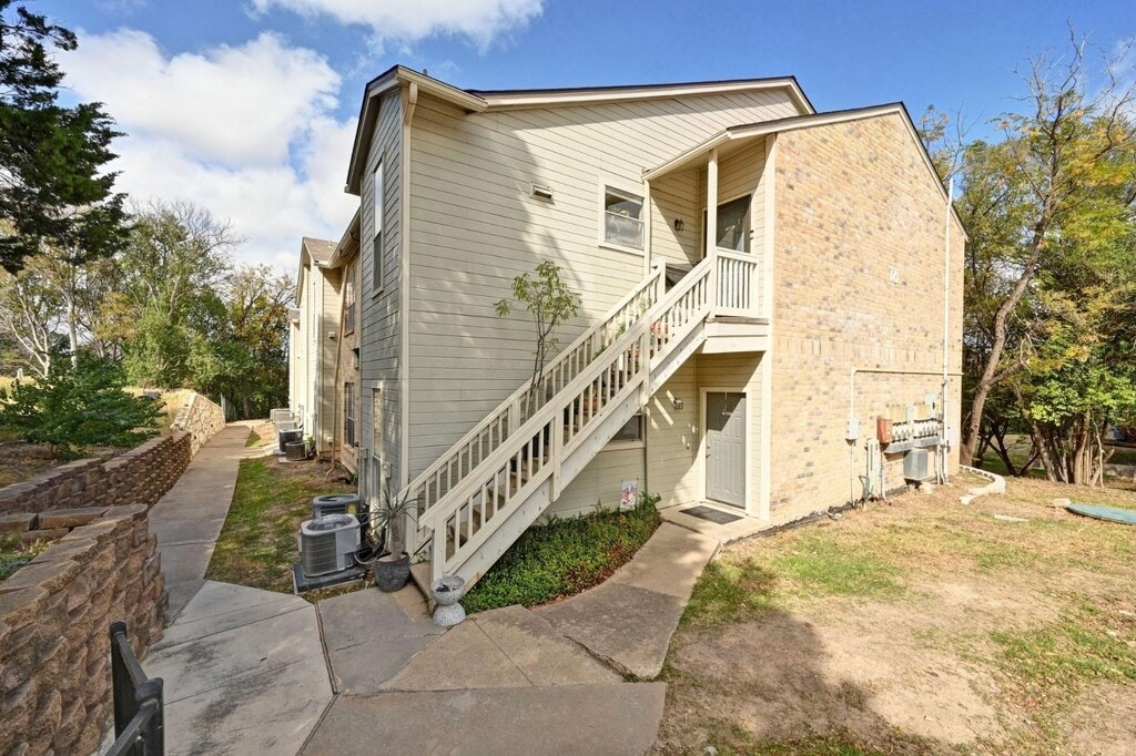 This first-floor condo offers comfort, convenience, and inviting modern style. The open layout is filled with natural light thanks to a sliding glass door leading to the private covered patio, perfect for morning coffee or unwinding at the end of the day. The living room features a cozy fireplace, while the adjacent kitchen includes bar seating, butcher block countertops, stainless steel appliances, and contemporary fixtures throughout. Both bedrooms are spacious, and the primary suite stands out with its own sliding doors to the patio and an ensuite bath with a double vanity and walk-in shower. Laminate flooring runs throughout the main living areas for easy maintenance and a refreshed look. Located in a gated community with two pool areas, a BBQ area, outdoor lounge spaces, and plenty of gathering spots, this home offers a relaxed lifestyle with excellent amenities just minutes from Downtown, the East Side, and Town Lake. Assigned resident parking plus guest spaces make coming and going simple. Refrigerator, washer, and dryer are included, along with lawn maintenance and water/trash service.