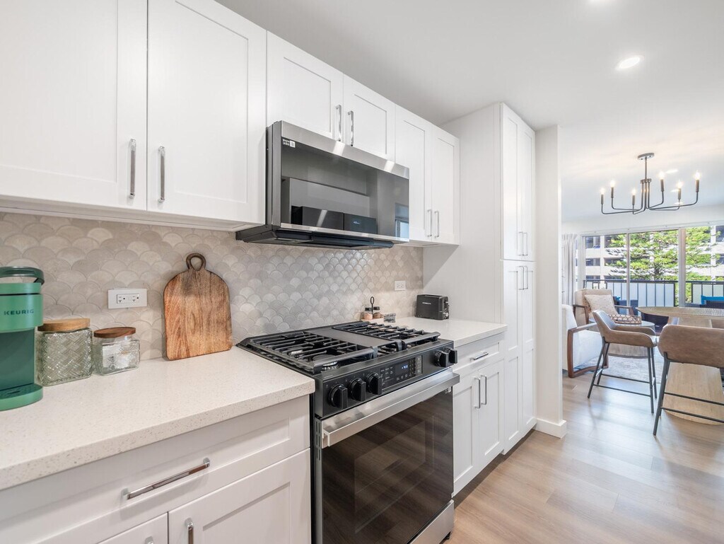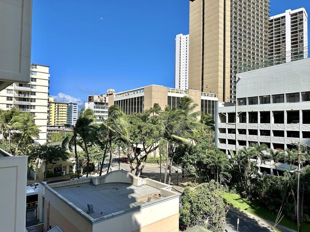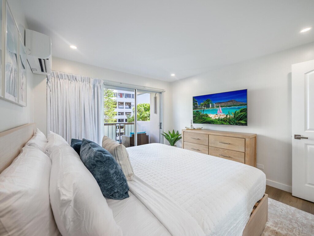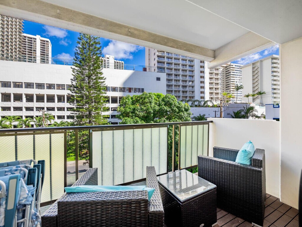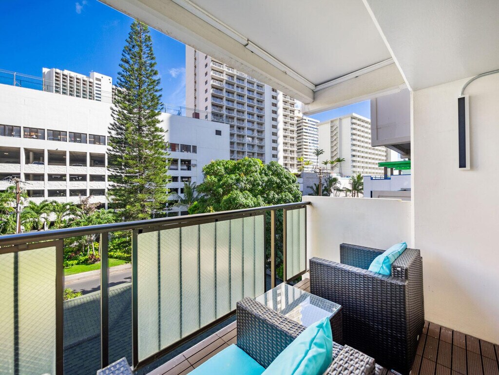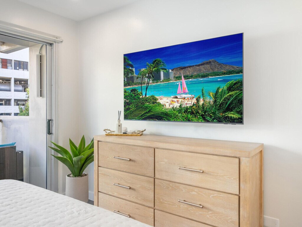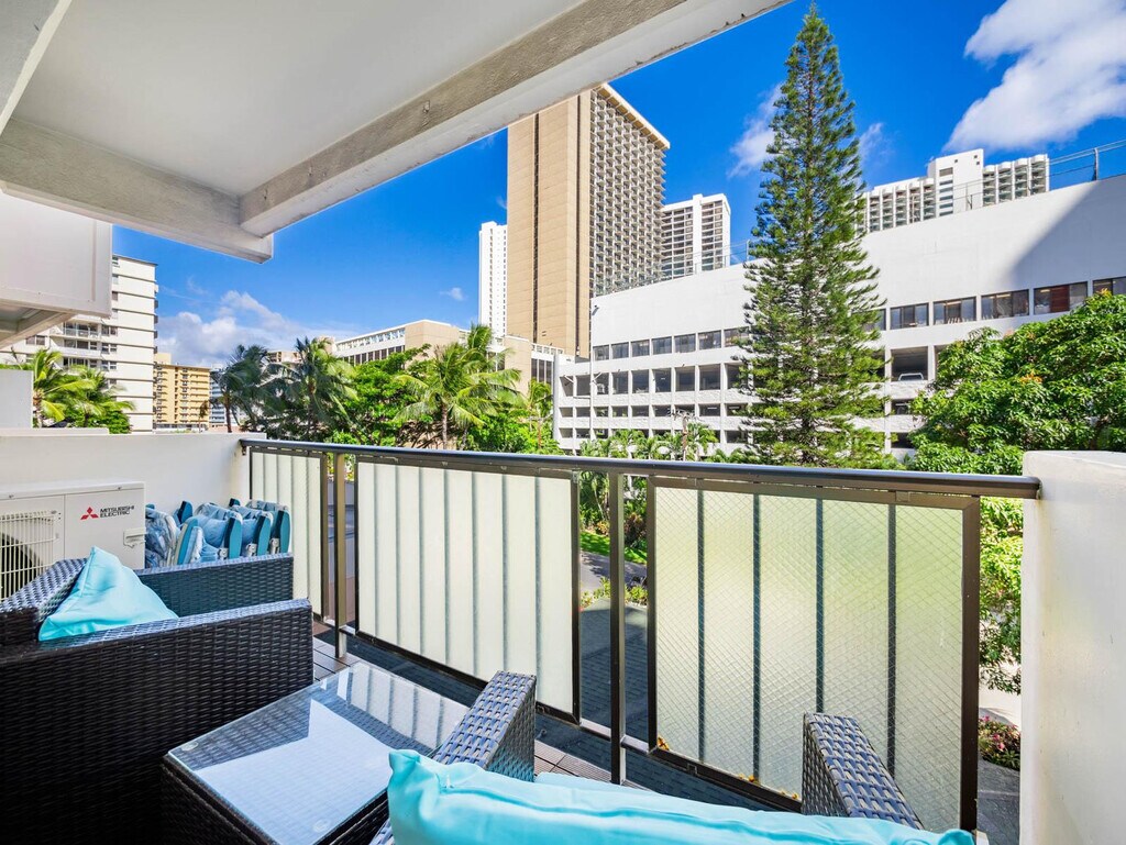 Aloha! Feel at home in this newly remodeled, minimalist-style apartment on the 6th floor of Kuhio at Waikiki, located just two blocks from Waikiki Beach. This 925 sqft unit offers the perfect opportunity to enjoy swimming and surfing. This apartment features a living room with a 75-inch flat-screen TV with streaming and cable services, and a balcony with city views. The kitchen is equipped with a gas stove/oven, microwave, refrigerator with ice maker and water dispenser, dishwasher, garbage disposal, Keurig coffee maker, and a table with 4 dining chairs. You'll also find bed linens, bath and beach towels, a hair dryer, dishes, silverware, cookware (including a blender and rice cooker), a Graco Pack N Play (travel crib), a highchair, child dinnerware, a vacuum, a broom, an iron, an ironing board, and board games like Scrabble and Jenga. A starter kit includes a paper towel, toilet paper, 1oz shampoo, 1oz conditioner, bath soap, hand soap, and liquid dish soap. One free parking spot is included for your convenience. Enjoy the convenience of nearby shops, restaurants, and nightlife in the heart of Waikiki. Check-in is at 3 p.m. and check-out is at 11 a.m. Housekeeping service, towel service, condiments/spices, coffee, detergent, beach chairs/umbrellas/toys, and coolers are not provided. Once the starter kit items run out, it will be your responsibility to supply your own. Registration Number: TA--03 [SI]