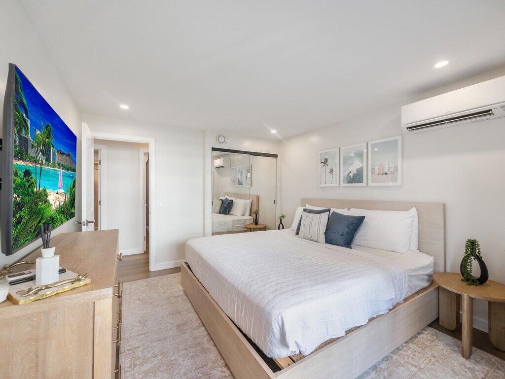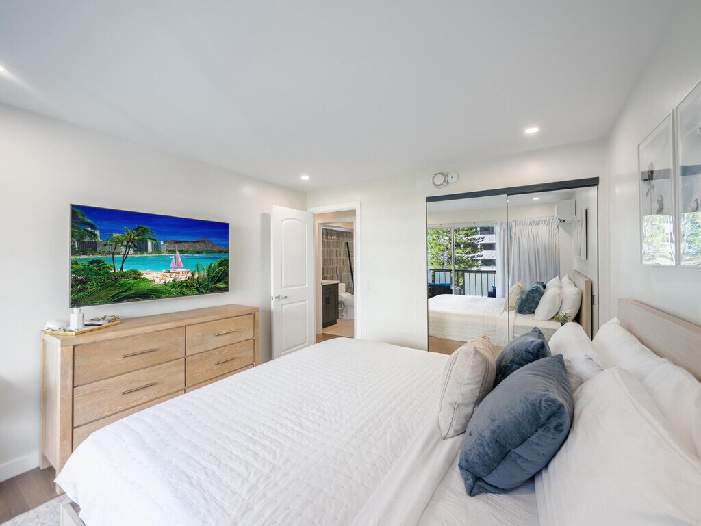 Aloha! Feel at home in this newly remodeled, minimalist-style apartment on the 15th floor of Kuhio at Waikiki, located at 2465 Prince Edwards Street. This 989 sq ft unit is in the heart of Waikiki. This apartment includes bed linens, bath and beach towels, a hair dryer, dishes, silverware, cookware (including a blender and rice cooker), a flat-screen TV with streaming and cable services in the living room, and flat-screen TVs with streaming only in both bedrooms. The kitchen is equipped with a gas stove/oven, refrigerator with ice maker, microwave, garbage disposal, Keurig coffee maker, and a table with 4 chairs. The primary bathroom features a shower and an LED mirror, while the guest bathroom also has a shower and an LED mirror. The living room has a queen-size sofa bed, and both the living room and primary bedroom have balcony access with chairs and partial ocean views. One free parking spot is included for your convenience. A pack-n-play travel crib and highchair with child dinnerware are also available. Just two blocks from the famous Waikiki Beach, this apartment offers the perfect opportunity to enjoy swimming and surfing. You'll also find plenty of nearby shops, restaurants, and nightlife to keep you entertained during your stay. Check-in is at 3 p.m. and check-out is at 11 a.m. A starter kit with a paper towel, toilet paper, shampoo, conditioner, bath soap, hand soap, and liquid dish soap is provided. Housekeeping service, towel service, condiments/spices, coffee, detergent, beach chairs/umbrellas/toys, or a cooler are not provided. Booking the additional day for early check-in and late check-out is highly recommended. Registration Number: TA--01 [SI]