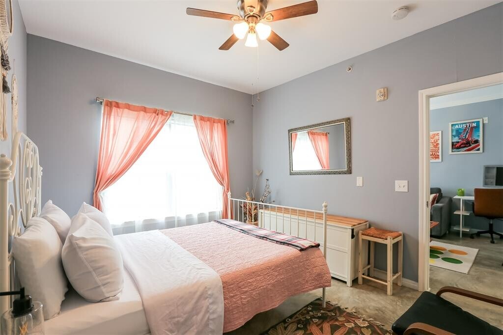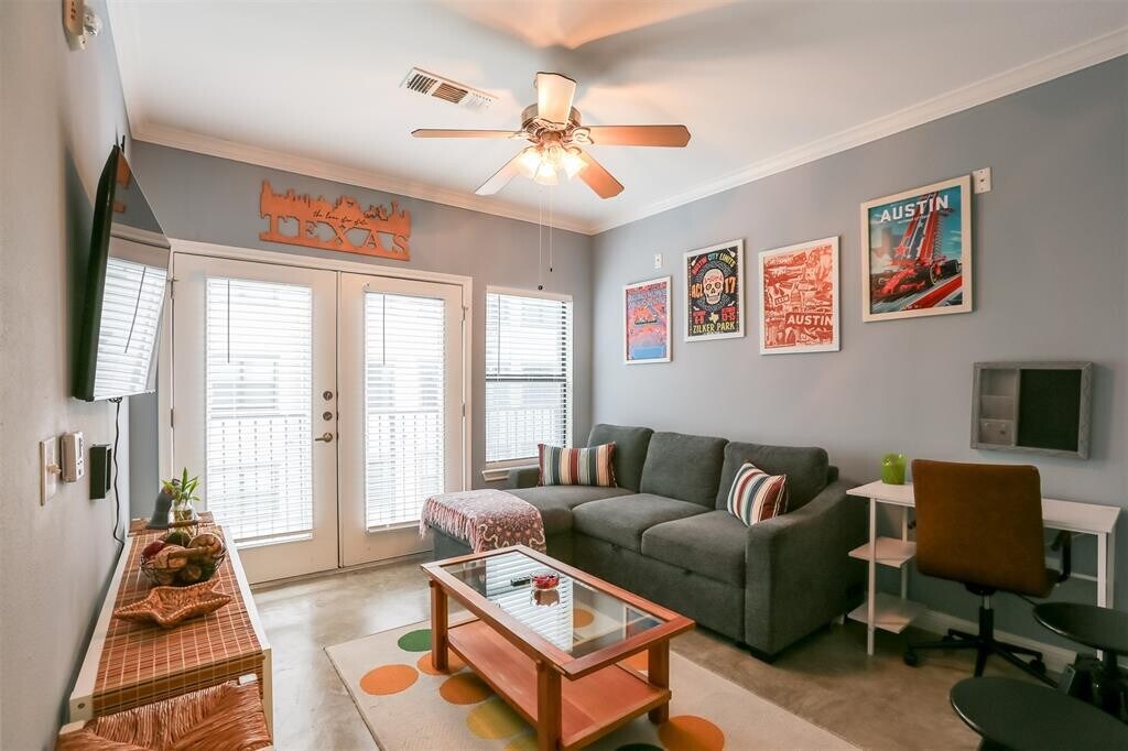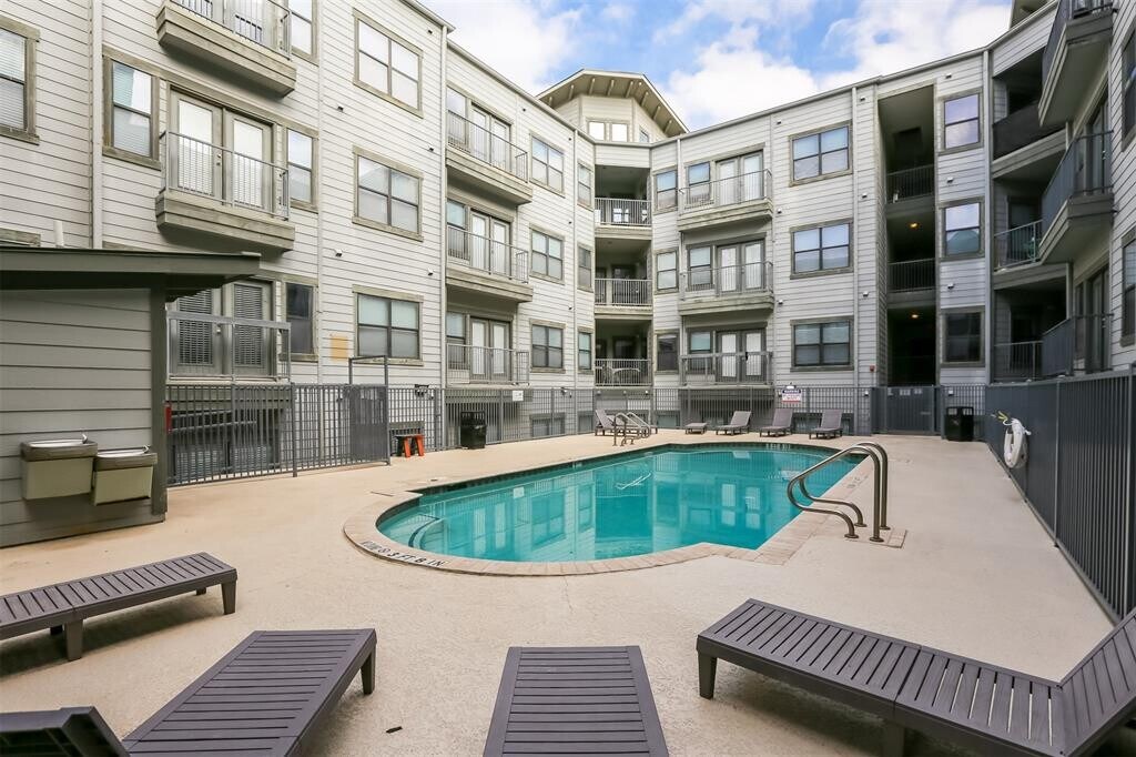 FULLY FURNISHED and poolside at Texan Shoal Creek Condos, this bright and modern 4th-floor one-bedroom West Campus condo is available for August 1, 2026 pre-leasing (**an earlier move-in date may also be available - contact us for details**). Located within walking distance of UT Austin, this open floor plan features stainless steel appliances, granite countertops, and stained concrete and tile flooring throughout. The owner plans to install a brand new washer and dryer in the unit. The spacious bedroom connects to a large walk-in closet and includes a motorized blind installed just six months ago. Your private balcony overlooks the community swimming pool and central sundeck courtyard. In addition to the pool courtyard, this gated community features a parking garage, elevator access, and a trash chute for easy disposal, and mailboxes are within the controlled access area. Google Fiber Webpass high-speed internet is available. The condo is just one block from the UT Shuttle, one block from the 24-hour Orange Market, and only a couple of blocks from Shoal Creek Trail and Caswell Tennis Center, with countless restaurants, cafes, and shops within walking distance. Pets are not allowed. Pre-lease now and enjoy the ease of securing a fully furnished condo in advance, making your move-in seamless and ready from day one. MLS ID 3779409