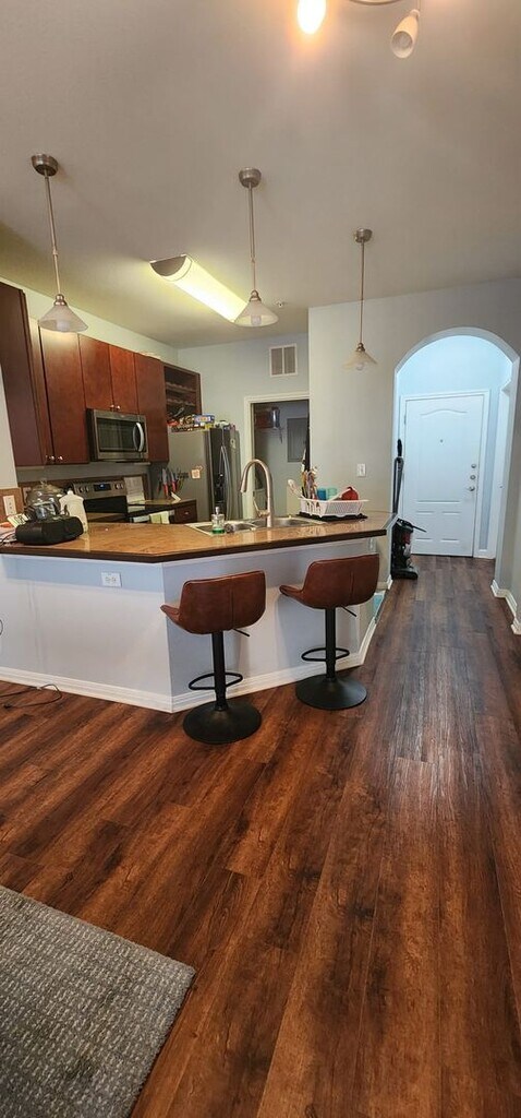 West Campus 3x2 at Texan Tower. Top floor unit, spacious open kitchen/dining/living room with high ceilings and plenty of windows for natural light. Windows face west, and there is a private balcony for enjoying the hill country view. Bedroom 1 and 2 are down stairs, both bathrooms are down stairs, 3 bedroom is upstairs and complete with window, closet and door. Vinyl plank flooring, stainless steel appliances, washer/dryer included. Rooftop pool, gated parking and mail area. 1 Parking & Water, Wastewater & Trash included. Reach out for details or to schedule a viewing.