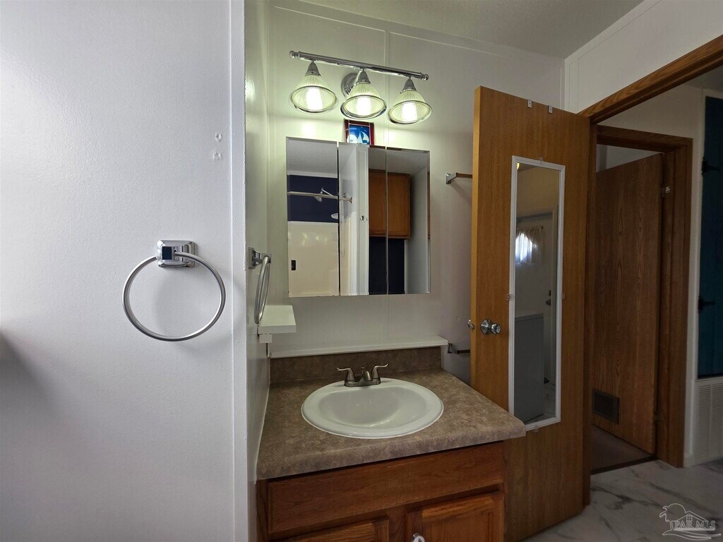 Welcome to this charming 3 bedroom,1 bath mobile home in Bayou Grande Villas,located in Southwest Pensacola. This home features an open floor plan with a kitchen/dining combo,which includes a breakfast bar and a pantry for all your culinary needs. The bright and airy living room is perfect for entertaining or relaxing in the evening. The split bedroom layout offers privacy,and the master bedroom includes an extra closet for storage. The home is all-electric and offers an indoor laundry area with washer/dryer hookups. Enjoy carpeting in the bedrooms and new vinyl flooring throughout the rest of the home. Energy-efficient amenities include double-pane windows,central heating and air,and ceiling fans. Outside,the spacious front deck is ideal for soaking up the Florida sunshine,while the side yard features a private gate leading to a greenway with seating for quiet moments in nature. The property is adorned with fruit trees and blueberry bushes for your enjoyment. No pets or roommates allowed. Residents also have access to a community pool,dock,boat ramp,and storage area for large vehicles and boats. Conveniently located near the back gate of NAS Pensacola,Naval Hospital,PSC,Perdido Key,and the beaches.