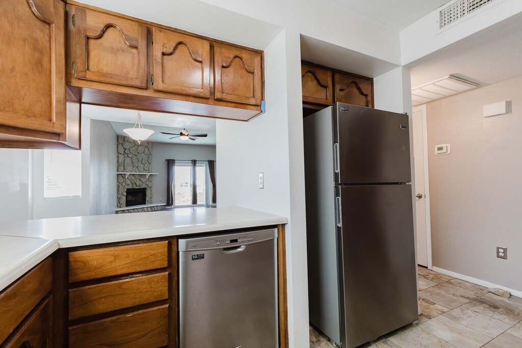 Welcome to the Two Bedroom Two Bath Townhouse, a charming residence in Alamogordo, NM. This home features two spacious bedrooms and two bathrooms, providing ample space for comfortable living. The house is equipped with a water softener system, ensuring you have access to quality water at all times. The cozy gas fireplace adds a touch of warmth and elegance to the living area, perfect for those chilly evenings. This property is pet-friendly, welcoming small dogs to be part of your home, upon owner approval. The house also features a one-car garage, providing secure parking or additional storage space. The small fenced yard is ideal for outdoor relaxation. The house has been recently upgraded with new windows and a fresh coat of paint, enhancing its appeal and energy efficiency. Experience the perfect blend of comfort and convenience in this lovely townhouse near the golf course. Check out our 3D tour:
