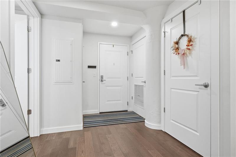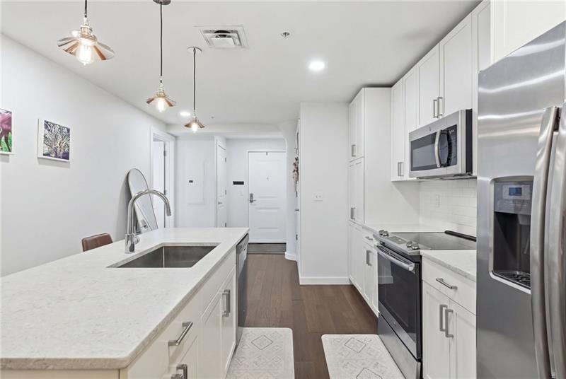 Experience elevated city living in the heart of Pittsburgh’s vibrant Strip District. This sophisticated residence features two spacious bedrooms, each with its own beautifully appointed ensuite bath and custom closets. Designed as a private retreat, the primary suite showcases a dual vanity and a spa-inspired wet-room shower complemented by a freestanding soaking tub. The chef’s kitchen serves as the centerpiece of the home, featuring quartz countertops, a striking waterfall island, GE appliances with a vented hood, and designer lighting. An open-concept layout provides generous space for both living and dining while preserving the building’s modern industrial character with a distinctive architectural column and exposed concrete ceilings. Step outside to your private patio — the perfect place for morning coffee or evening relaxation. A dedicated laundry closet and convenient half bath complete the residence. Garage parking is included, a rare and valuable amenity for city living. Residents also enjoy access to exceptional building amenities, including a stylish lounge, rooftop terrace with firepit and grilling area, and a fully equipped fitness center. Ideally located just steps from the Strip District’s renowned dining, specialty markets, entertainment, and the riverfront trail.