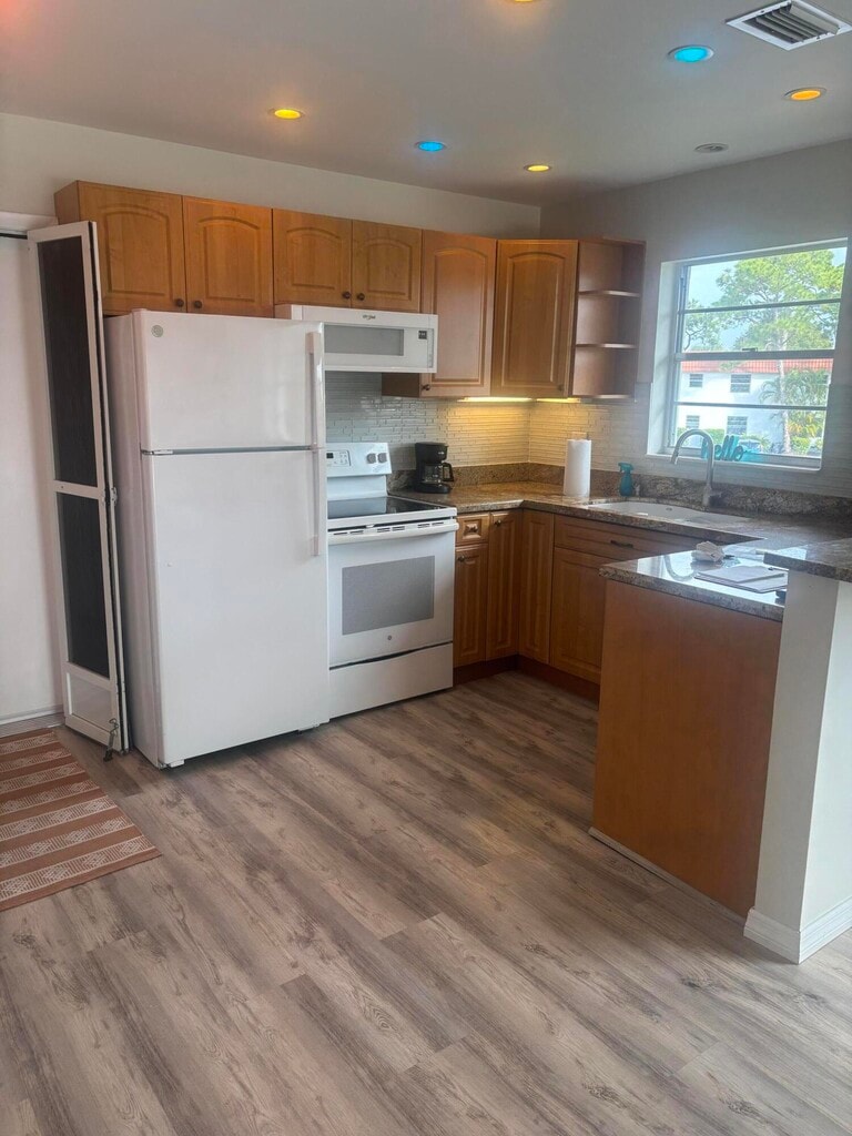 Beautifully updated 1/1 unit on the 2nd floor. Unfurnished (except for a bed). The list of renovations includes gorgeous new laminate flooring, white shaker cabinets, quartz countertops, new s/s appliances, kitchen wall opened up, bathroom is new from top to bottom, barn door from bedroom to bathroom, new impact windows and A/C. Vista Pines is a wonderful 55+ community with lots of activities like, card playing, shuffleboard, bocce ball, swimming, aerobics, dances, cookouts, karaoke, water exercise, a fitness center, library, table tennis, two full size pool tables and a wood working shop. Conveniently located to the beach, shopping, restaurants, bowling, golfing and so much more!