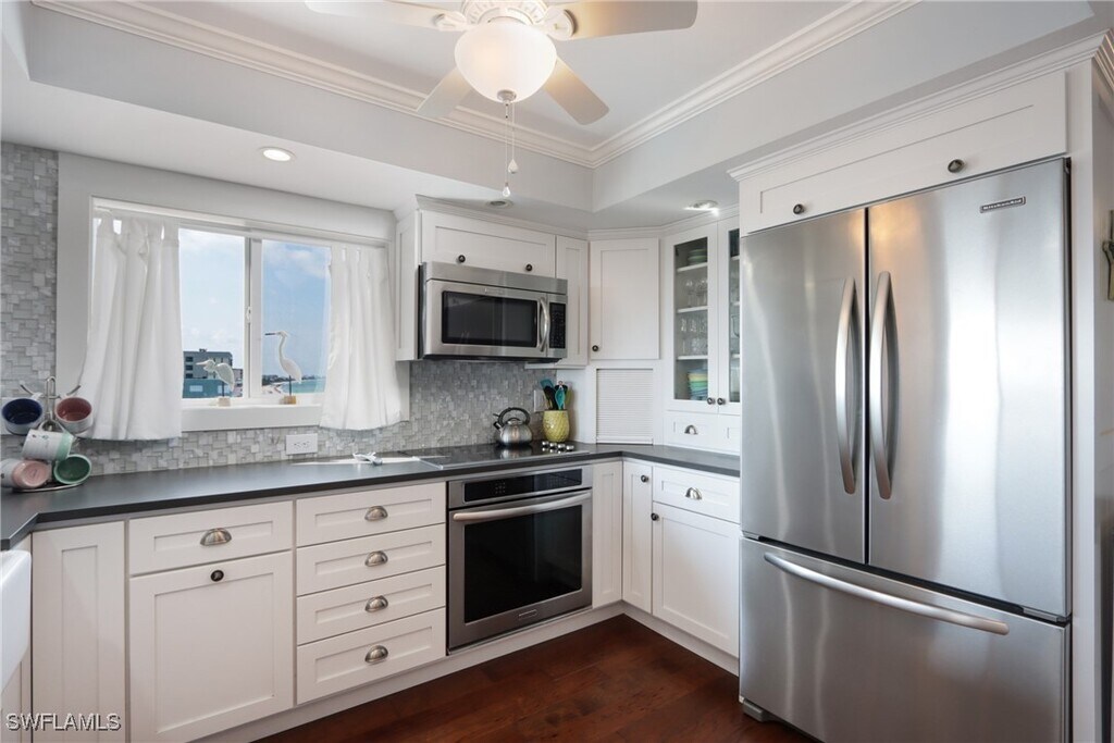 This Condo Rental is a beachfront beauty! This End unit location,you will experience more of a southern exposure panoramic views and spectacular sunsets. Renovated and tastefully decorated with coastal décor. Upgrades include wood flooring in the living areas,stainless appliances,slate countertops,farmers sink,beautiful backsplash in kitchen,designer lighting,plantation shutters on some windows,large stacked washer and dryer,and so much more! The primary suite features a king bed,TV,walk-in closet,and ensuite bathroom with glassed enclosed walk-in shower. The guest bedroom features a queen bed and guest bathroom with combo tub and shower. The fully equipped kitchen area has a breakfast bar,and dining area for 4. The living area has a sofa,two chairs and a large screen TV. This unit also comes with a storage area outside the unit,1 covered parking space,and WIFI. Enjoy the beach,shelling,dolphin watching,or just relax on the beach. The pool and common area have been completely remodeled.