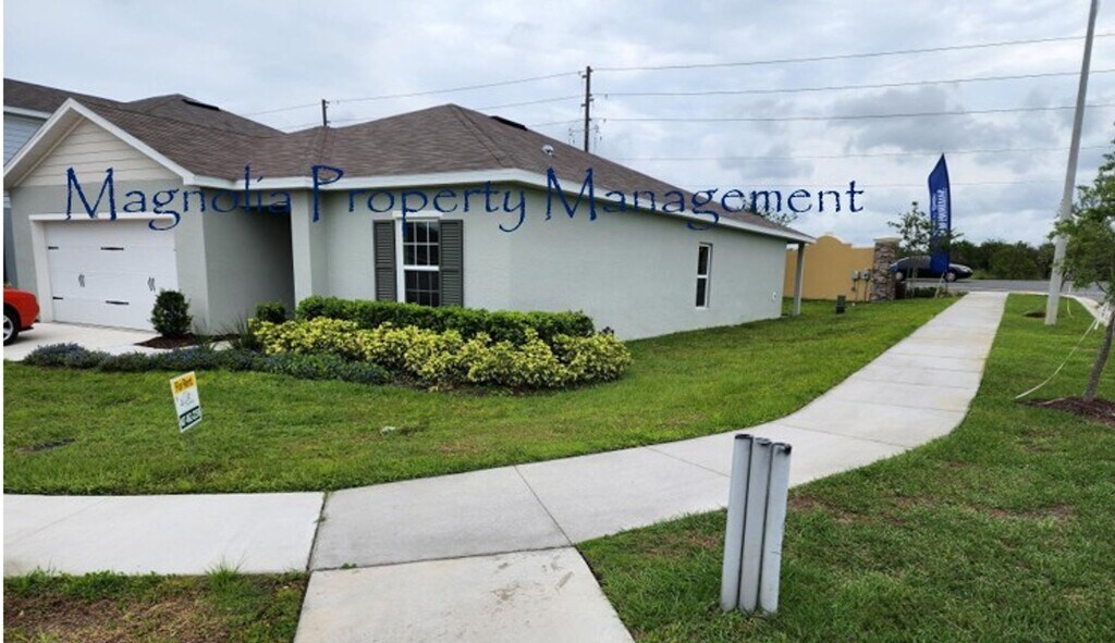 4 bedroom 2 bathroom split floor plan, 2,167+/-square foot single family home previously used as the model home for the community. Tile floors through out with plush carpet in all of the bedrooms, large 12x17 master suite with a large master walk-in closet, spa style master bathroom with dual vanity and large walk-in shower. Large center island kitchen with state of the art stainless steel appliances and granite counter tops, inside utility room with washer and dryer, high efficiency HVAC with wireless thermostat, LED lighting, window treatments, 2 car garage with electric garage door opener, 8x10 covered lanai. Community pool and play ground. Close to Lego Land and all of the Central Florida attractions. Centrally located between Tampa and Orlando with access to shopping and dining.