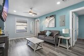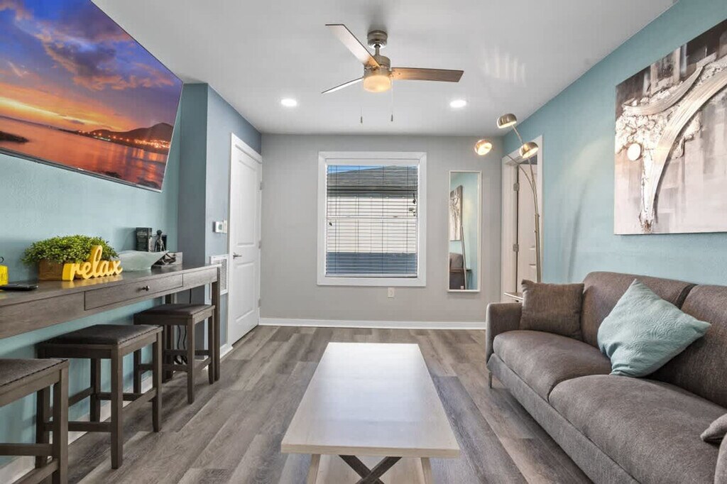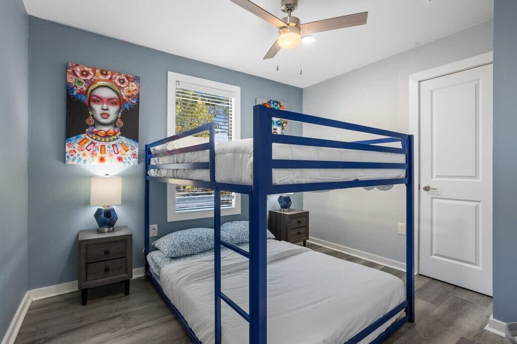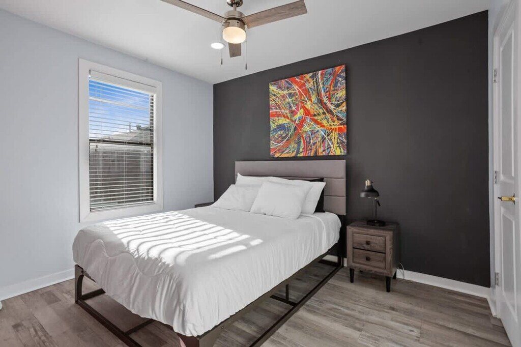 Experience the best of Houston in this modern 6-bedroom apartment, perfect for events or extended families. With exclusive access to three 2-bedroom units, this apartment comfortably sleeps up to 16 guests. Enjoy the convenience of full kitchens, laundry facilities, air conditioning, and smart TVs. Located near the University of Houston, Midtown, and the Medical Center, this apartment offers easy access to Houston's iconic attractions. Feel at home in this contemporary apartment featuring a fully equipped kitchen with appliances, utensils, and essentials. The living room offers a big-screen smart TV, comfortable seating, decor, books, and games, making it an ideal space for relaxation and entertainment. Each master bedroom is furnished with a queen-size bed, closet, fan, nightstands, and lamps, while the guest bedrooms include full over queen bunk beds and queen-size beds. Parking is available with four outdoor spots on a first-come, first-served basis, along with free street parking options. A pet cleaning fee applies for approved pets, and unauthorized pets will incur a $500 extra fee. Guests can also access a community gym through a partnership with Emancipation Park, located a short drive away. Nestled in Houston's historic Third Ward/MacGregor area, this apartment is part of a neighborhood known for its rich cultural roots and central location. Enjoy easy access to Downtown, the Texas Medical Center, and the Museum District, all just a 10-15 minute drive away. Nearby essentials include the HEB supermarket, Chase and Bank of America, and popular dining options like Blodgett Food Hall. The area is well-connected with local bus stops and METRORail stations within walking distance, providing direct access to key destinations. This apartment is located in a recently renovated home within a historic district, which may result in some noise from units above due to the wooden structure. Quiet hours are observed between 10:00 PM and 8:00 AM, and unauthorized parties will incur associated fees. Smoking is permitted outside the property only. Check-out is at 10:00 AM, and flexible check-in and check-out options are available for a small fee. Avoid leaving valuables in your vehicle due to the downtown proximity. Stay connected with high-speed Wi-Fi offering 1Gbps internet, making this apartment remote work-friendly. The single-level access ensures ease of movement throughout the apartment, and additional heaters are provided for comfort. [SI]