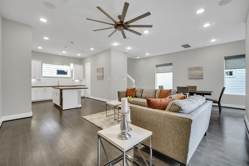 Welcome to this beautifully maintained home in Houston’s sought-after East Downtown neighborhood—just minutes from UH,Med Center,and downtown. Tucked inside a secure gated community,this home stands out with its rare fenced yard,covered patio perfect for grilling,and oversized balcony for relaxing or entertaining. Step inside to find soaring ceilings and abundant natural light. Modern finishes throughout: engineered wood flooring,plush carpeting,and elegant tile and a spacious,open-concept living/dining area with a convenient powder bath on the main floor. The kitchen is a chefs dream with shaker-style cabinets,stainless steel appliances,gas range,large island,and upgraded window coverings. Generously sized closets and a luxurious primary suite featuring a spa-like bath with soaking tub! This home blends city convenience with modern comfort—and it’s ready for you to move in and love every inch of it! MLS# 87370935