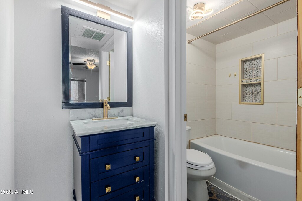 Resort-style living in gated community near the Biltmore, minutes from the 51 freeway, and world-class shopping and restaurants. Close to downtown, Arcadia, and Paradise Valley. This 1 bedroom 1 bath unit is updated with white tile, cabinets and counters, and has new A/C, refrigerator, washer/dryer and carpet. This quiet unit is near the back of the complex and has a private, shaded balcony, and a covered parking spot.