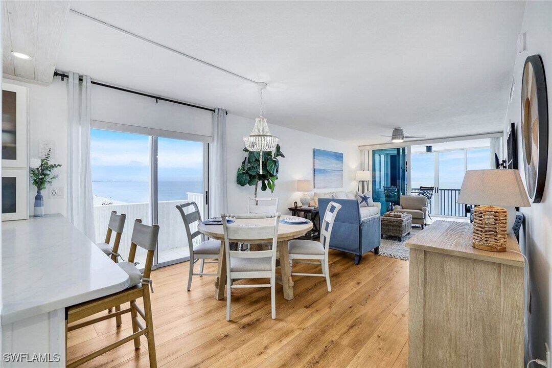 Beachfront Bliss with Spectacular Gulf Views on Bonita Beach! Wake up to the sound of gentle waves and end your day with stunning sunsets over the Gulf in this beautiful 2-bedroom,2-bath beachfront corner unit residence. Offering panoramic views from Naples to Sanibel,this updated coastal-inspired getaway features soothing sea-glass tones,light color flooring and nicely appointed furnishings providing complete comfort and relaxation. Step out onto your screened lanai to watch dolphins and manatees play,boats drift by,and the sun melt into the horizon. Inside,enjoy an open floor plan with a bright kitchen,separate dining area as well as updated bathrooms,a spacious laundry room,and a beautiful guest bedroom. The Egret is being beautifully reimagined with lush tropical landscaping,a heated beachfront pool,community room with full kitchen and bathrooms,BBQ and more. The new pool deck is complete,the building freshly painted,and the new lobby ready to welcome you! Perfect for families,couples,or a friends’ getaway,this condo offers the best of Bonita Beach living—relax by the pool,stroll along the sugar-sand shore,or explore nearby waterfront dining.