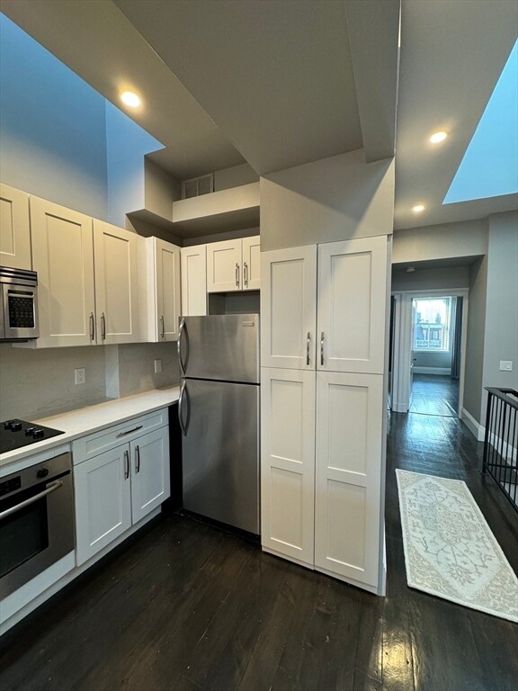 Experience your best life in Back Bay with this floor thru FULLY FURNISHED front facing penthouse that features: - Welcoming entry foyer w/ closet space! - Hardwood flooring shining throughout! - High end, fully equipped kitchen! - Stainless appliances inc dishwasher! - Quartz countertops & breakfast bar! - Open concept floorplan w/ 10 foot ceilings! - Skylights drenching living room in sunlight! - Charming decorative marble fireplace! - 2 generously sized equal bedrooms! - Large closets & ample storage space! - Luxuriously updated marble full bathroom! - Convenient in unit washer & dryer! - Central heating & air conditioning! - Classic wrought iron spiral staircase! - Expansive private roof deck w/ amazing views!