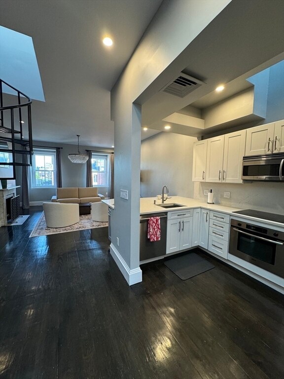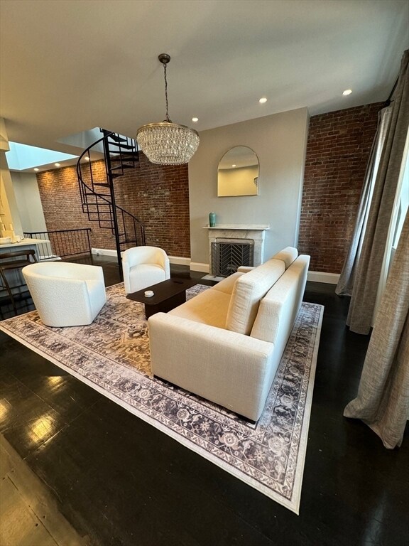 Front Facing! Totally Renovated 2BD floor-through Penthouse w/ 300 sqft private roof deck featuring sweeping City & Charles River views. Steps from Copley square and the Esplanade, this sophisticated 2020 renovation combines original Back Bay character including Carrara marble and exposed brick with modern luxury and elegance. All new kitchen, bathroom, recessed and chandelier lighting, central air, built-in closets & restored flooring. Wonderful open layout can accommodate spacious living + dining and features a Marble wood-burning fireplace, oversized windows,10 ft ceilings and soaring skylights. The large kitchen features quartz counter, backsplash & breakfast bar, custom cabinets, abundant storage & Bosch appliances. The chic bathroom w/marble accents compliments the entire design. Two bright bedrooms feature built-in closets and charming views. In-unit spiral stairs provide access to the private roof deck and cherished outdoor space. 4th Floor Walk Up.