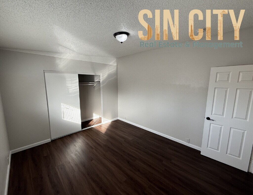 This move-in ready, 1-bedroom, 1-bathroom apartment is located in a gated complex with high-security cameras for added safety. The lower-level unit features an open floor plan with modern laminate flooring throughout. Please note: the photos shown are not of the specific unit but are of a similar floor plan with comparable finishes and layout. The kitchen is equipped with upgraded appliances, including a stove and refrigerator, accented by sleek white countertops. The upgraded bathroom includes a stylish shower, and the spacious walk-in closet provides plenty of storage. Additional perks include onsite laundry and open parking for your convenience. Don't miss out on this beautiful, well-maintained home—schedule a tour today! Sin City Real Estate and Management LLC B.1003001.LLC Move in fees: First Months Rent Security deposit Pet Rent