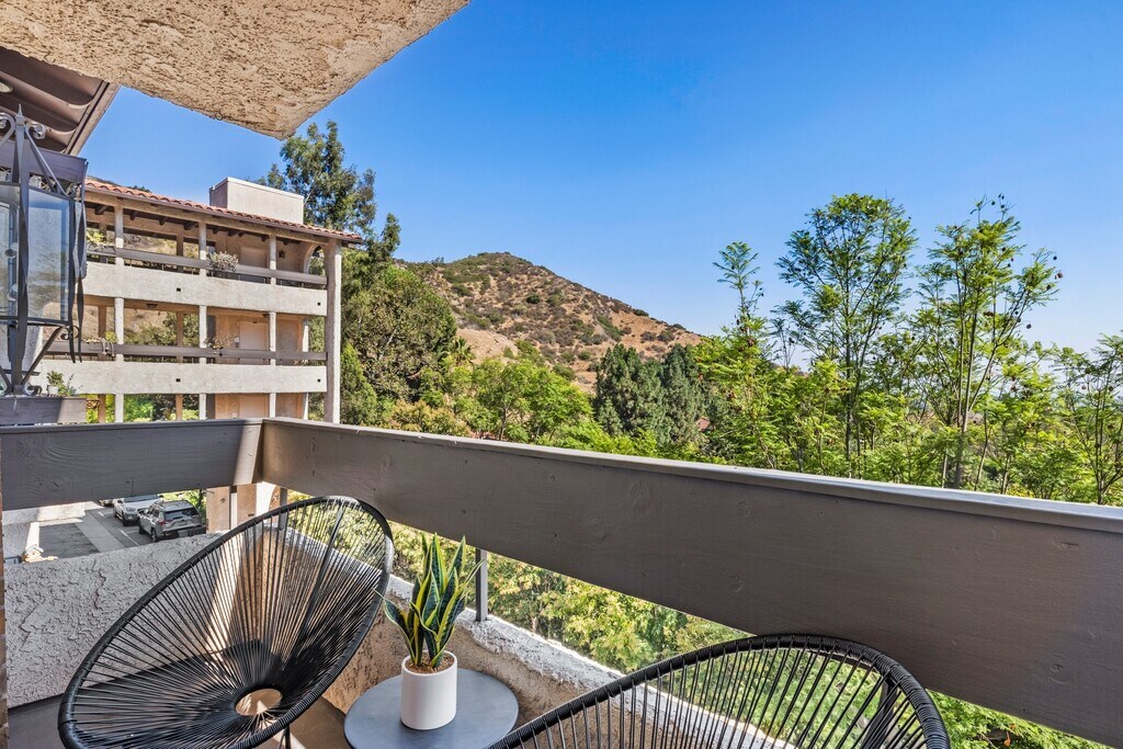 Welcome to Cahuenga Hills Tennis Condominiums, a 15 acre resort style complex with guard gated entry and offering an impressive array of amenities. Nestled into Cahuenga Pass, this unit is in building 3, which is the deepest back into the hills and furthest away from the freeway. A bright unit, with bamboo flooring and tons of natural light. The kitchen features a brand new stainless steel Bosch 800 Series, industrial grade gas range with 5 burners, Frigidaire Pro over-the-range microwave / convection oven combo and a stainless steel wine cooler. Kitchen counters are white quartz and with bar-top seating, allow one to move freely from the living room to the kitchen while enjoying the view across the Hills towards the South Bay. Before the bedroom, and off the entry, is your in-unit laundry area featuring a new Bosch 300 series stackable front load washer/ dryer. The home has a keyless smart entry pad and an Alexa enabled smart thermostat that controls the central HVAC. The bedroom is generously sized with space for a desk/work space and features a walk-in closet. Off of the living room the balcony has space for bistro table and chairs to enjoy morning coffee or warm evenings. A rare and special feature is that from outside your building there is access the private Terracotta trail leading out of the community and up to the ridge with a spectacular view over Lake Hollywood and the entire city. This invites an active lifestyle, as the community also offers two pools, Jacuzzi, three tennis courts, and a modern/updated gym with top tier equipment. The community clubhouse has two billiard tables and a brand new ping pong table, kitchen and lounge area. In addition to the main pool, right behind our building is a secondary and more secluded one. Be in the heart of town next to LA's top attractions including Runyon Canyon, Franklin Village, and the The Hollywood Bowl with convenient access to the freeways and to the Valley. Rent includes water, waste disposal and Spectrum WiFi. There is also additional private storage above your assigned covered parking space. MLS# 25569963