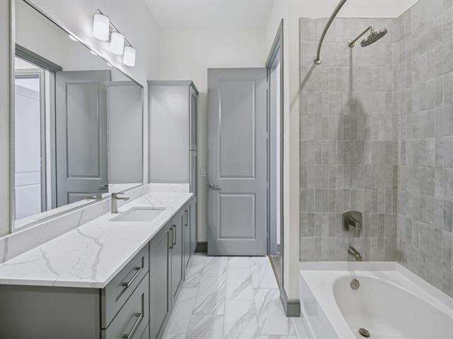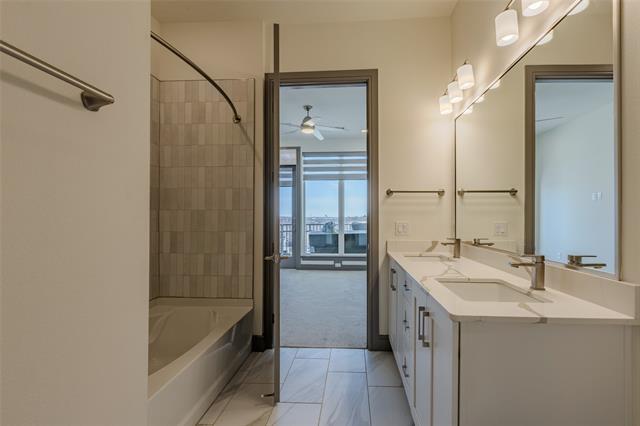 Experience refined urban living at The View, a premier mixed-use luxury community ideally situated in the heart of Carrollton. Overlooking the serene Furneaux Creek Nature Area and positioned along the Blue Trail, this residence offers a rare blend of natural beauty and sophisticated city convenience. This elegant 2-bedroom, 2-bath condominium showcases a spacious open-concept design filled with natural light and tranquil greenbelt views. Thoughtfully designed for both comfort and entertaining, the seamless flow between living, dining, and kitchen areas creates an elevated yet welcoming atmosphere. The chef-inspired kitchen features quartz countertops, sleek cabinetry, and a built-in desk area—ideal for remote work or executive needs. The primary suite serves as a private retreat, complete with dual vanities, a soaking tub, a separate glass-enclosed shower, and an expansive walk-in closet. The secondary bedroom offers its own ensuite bath, providing exceptional privacy for guests or family members. Step onto your private balcony and enjoy peaceful views, creating the perfect setting to unwind after a busy day. Two reserved parking spaces in the secure garage add convenience and peace of mind. Residents of The View enjoy resort-caliber amenities including a sparkling pool, state-of-the-art fitness center, yoga studio, two-story clubhouse with social lounges and meeting spaces, outdoor grilling areas, dog park and wash station, and direct access to scenic trails. Ideally located near H-Mart, 99 Ranch Market, premier dining, retail, Downtown Carrollton, and major highways, this residence offers seamless connectivity throughout the DFW Metroplex. An exceptional opportunity to experience luxury, lifestyle, and location in one distinguished address.