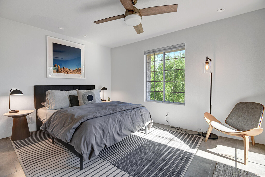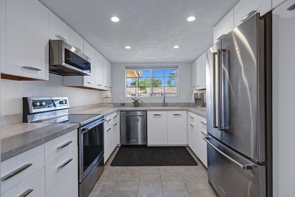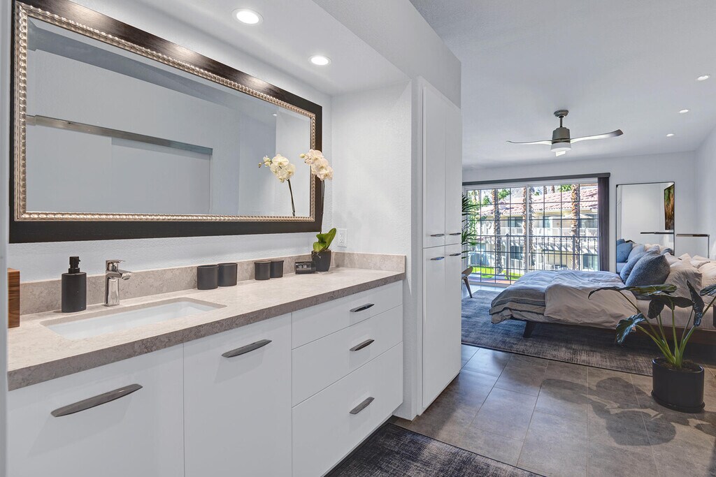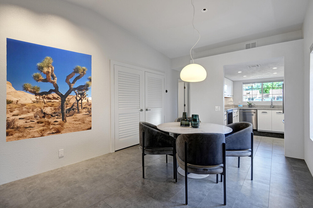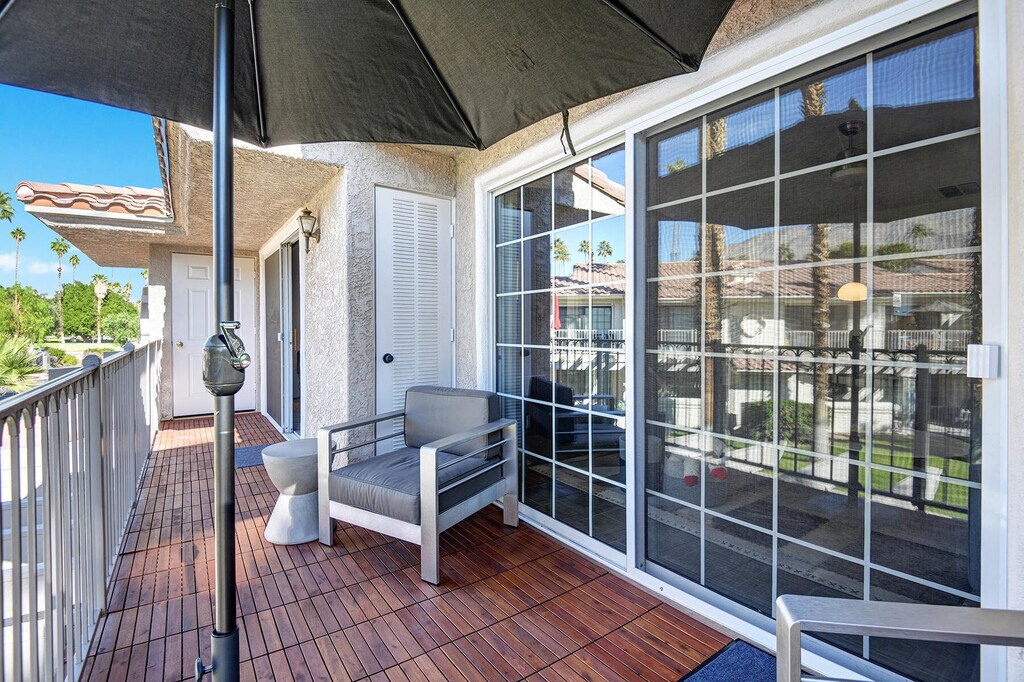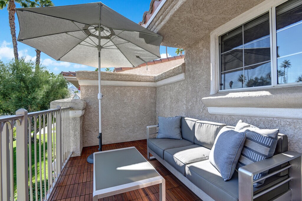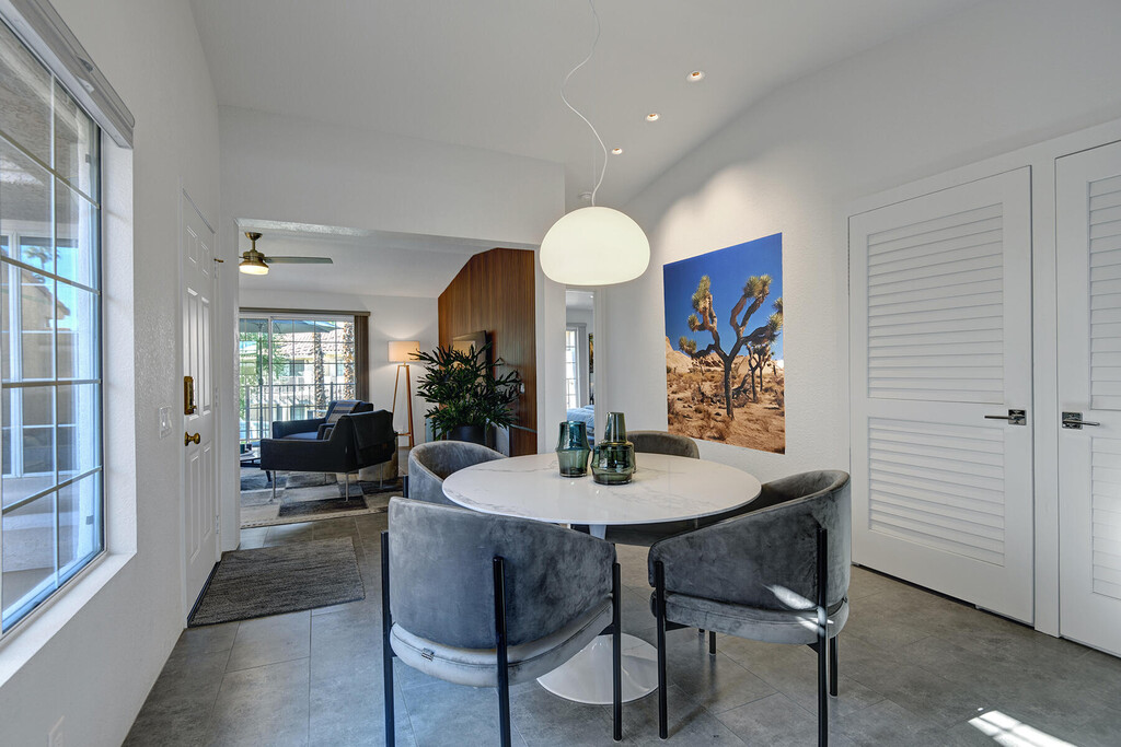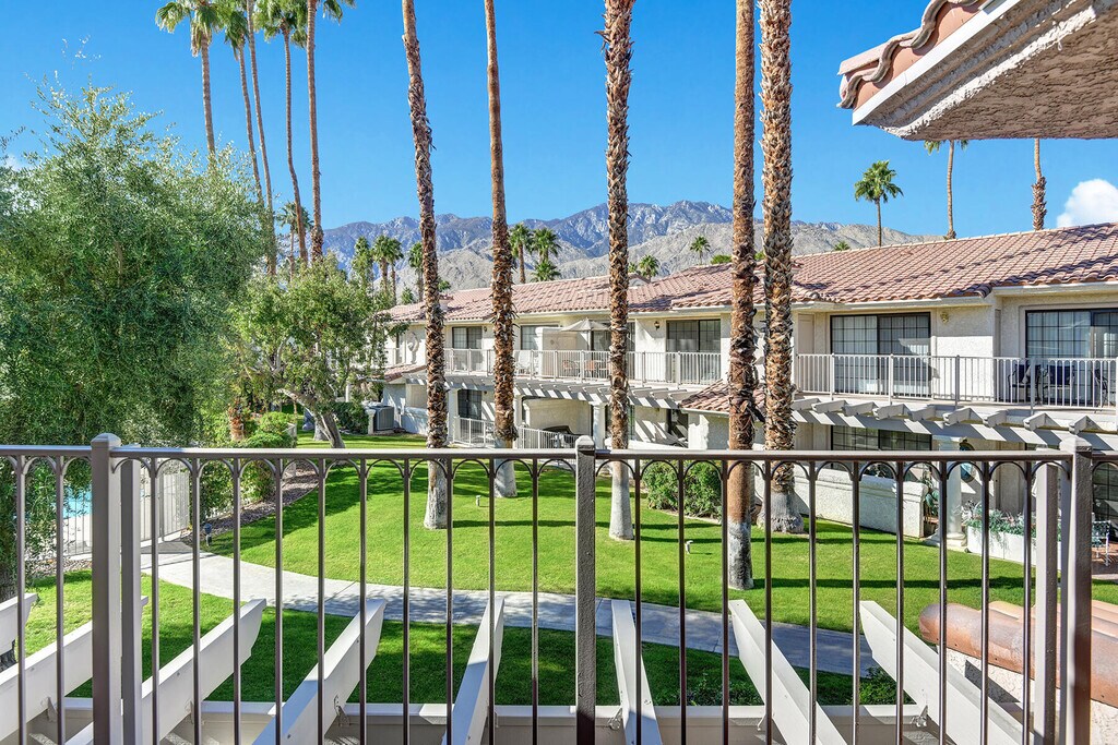 Welcome to your fully remodeled 2BR/2Bath oasis at Mesquite country club! This light,bright,upper level,move-in,ready gem offers spectacular mountain view,located in a serene,amenity-rich community. Exquisitely furnished and armoring fine arts immerse yourself in what Palm Springs lifestyle is all about. Enjoy the tranquility of a quiet neighborhood,paired with 2 tennis courts,7 heated pools and 7 spas and more. Your ideal rental awaits. 10 minutes to downtown Palm Springs. Fully equipped kitchen,newer washer/dryer in laundry closet and appliances,smart TVs in the Master bedroom and living room,indoor and outdoor dining,higher ceilings,high speed internet and cable.