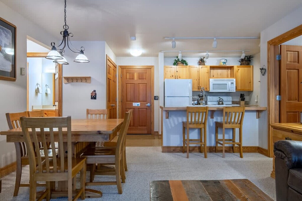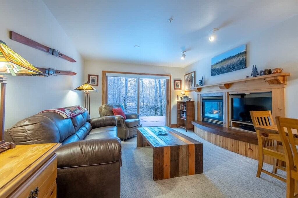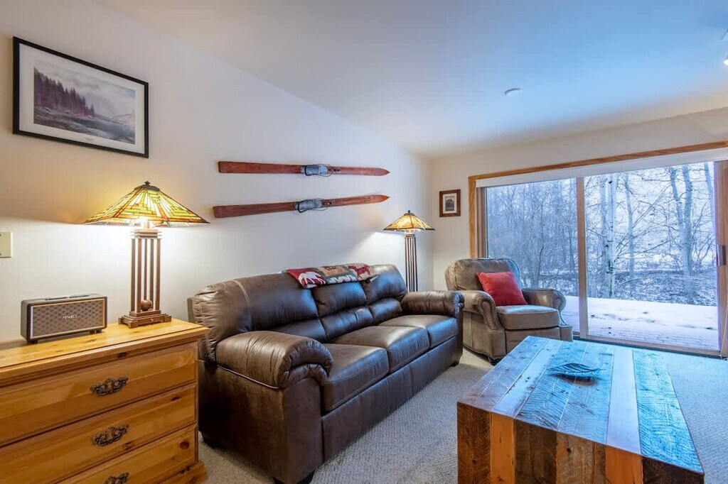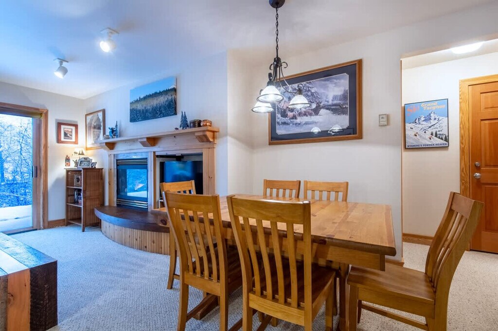 Experience the serenity of the Tetons with this delightful condo nestled at the base of the mountains in the coveted Teton Creek Resort. The resort, boasting three community hot tubs, is a mere 9 miles from the pristine slopes of Grand Targhee. Plus, with the Targhee shuttle service picking up right at the location, your ski adventures couldn't be more effortless! This ground floor condo at Teton Creek Resort features recent updates to interior furnishing and Smart TVs. The master suite offers a spacious king-size bed and a dedicated en-suite bathroom, while the guest room is furnished with two queen beds. The fully equipped kitchen includes modern appliances and a drip coffee maker, with bar seating for three, perfect for quick breakfasts or evening chats. A dedicated dining area accommodates six, inviting you to relish meals with loved ones. All grills at Teton Creek Resort, including this one, are electric, perfect for that evening cookout. Sink into the plush couch and oversized chair in the living room, adorned with tasteful western accents, and enjoy the warmth and ambiance of a gas fireplace. Proximity is key! This is the nearest condo complex to Grand Targhee Resort. A short 4-mile drive will take you to the heart of downtown Driggs, bustling with exquisite dining options and charming shops. Step out or gaze through the windows to witness an unspoiled view of lush aspens. With a westward orientation, the condo basks in the gentle glow of the afternoon sun, casting a magical, filtered light throughout. Conveniently located between two entrances to Yellowstone National Park, you can access hiking and activities in the Tetons here in Teton Valley, affectionately known as the quiet side of the Tetons. Distances to nearby ski resorts and regional airports make this location ideal for exploring the region. The minimum age of the primary renter is twenty-five years. The number of people at the property should not exceed the maximum sleeping capacity. Quiet hours are from 9 pm to 8 am, and no events, parties, or large gatherings are allowed. No smoking or vaping is permitted in the home or on the decks, and Teton Creek Resort is a no-smoking complex. Smoking is only allowed in the designated outdoor smoking area, adjacent to the Bannock Building parking area. A maximum of two licensed vehicles is allowed in the parking area. No riding snow machines, dirt bikes, or ATVs in the subdivision or at the rental property. Please do not burn candles or incense in the home. No fireworks on the premises. Keep all main entry doors locked when not occupied. Fines will apply for violations, including but not limited to: leaving garbage in the house or litter on grounds, failure to disclose or clean up after pets, smoking in the house or garage, failure to follow house rules and respect posted signs, failure to follow check-out procedure, mistreatment of hot tub, or violations of local laws. A minimum $500 fine applies for smoking or vaping in non-designated areas, violation of house rules, posted signs, laws, or failure to vacate at check-out time. [SI]
