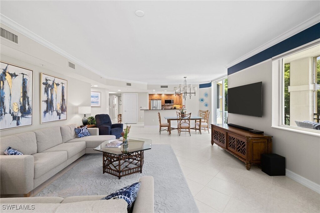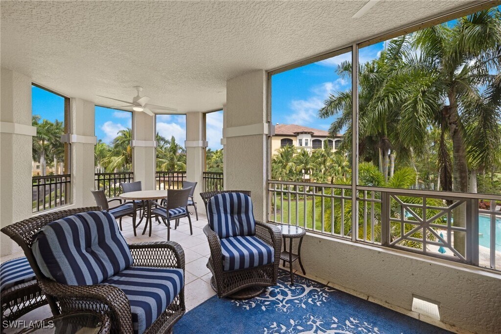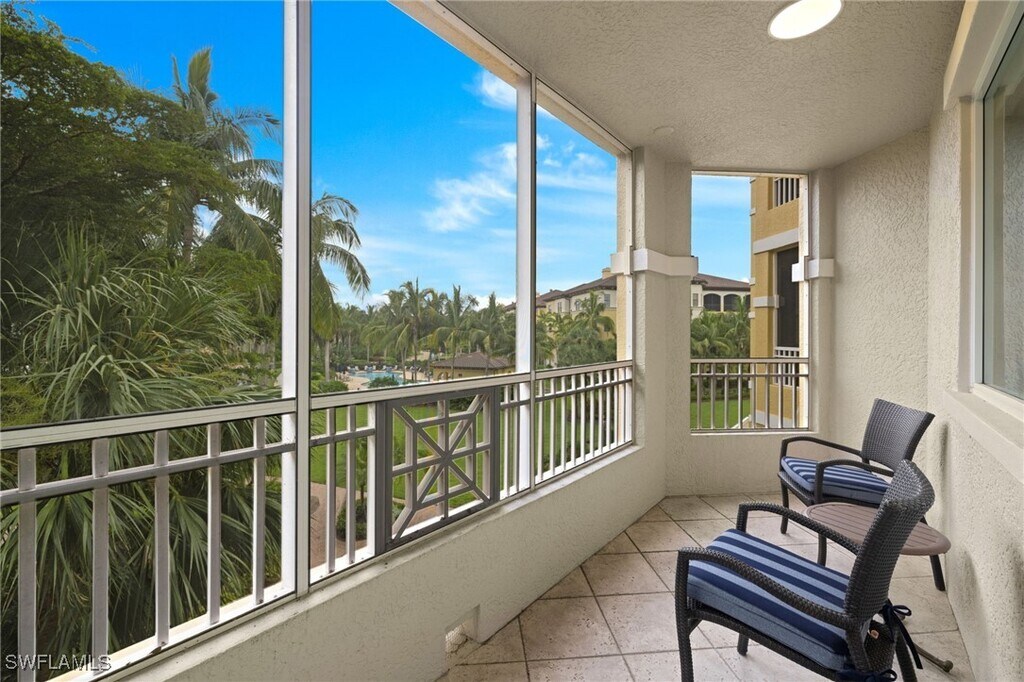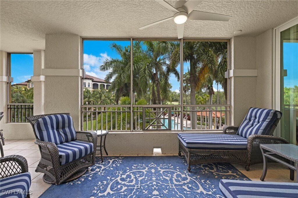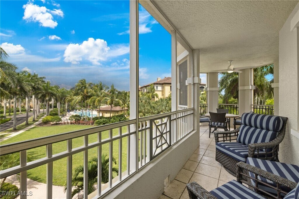 his exquisite 2-bedroom 2-bath fully furnished rental property has one of the best views in Ventanas of Tiburon. Enjoy the stunning views from the expanded screened lanai and open terrace overlooking the palm trees,sparkling blue pool,and the Greg Norman Championship golf course. Tiburon is minutes from the Gulf Beaches,popular dining and shopping at Mercato and Shoppes at Vanderbilt. This first floor unit has a dedicated under building parking spot and is as close as you can get to the two available resort style pools,hot tubs and grills. This rental also includes all the amenities that come with the Tiburon Ritz Carlton social membership if desired for an additional fee. Minimum 30 day rental.